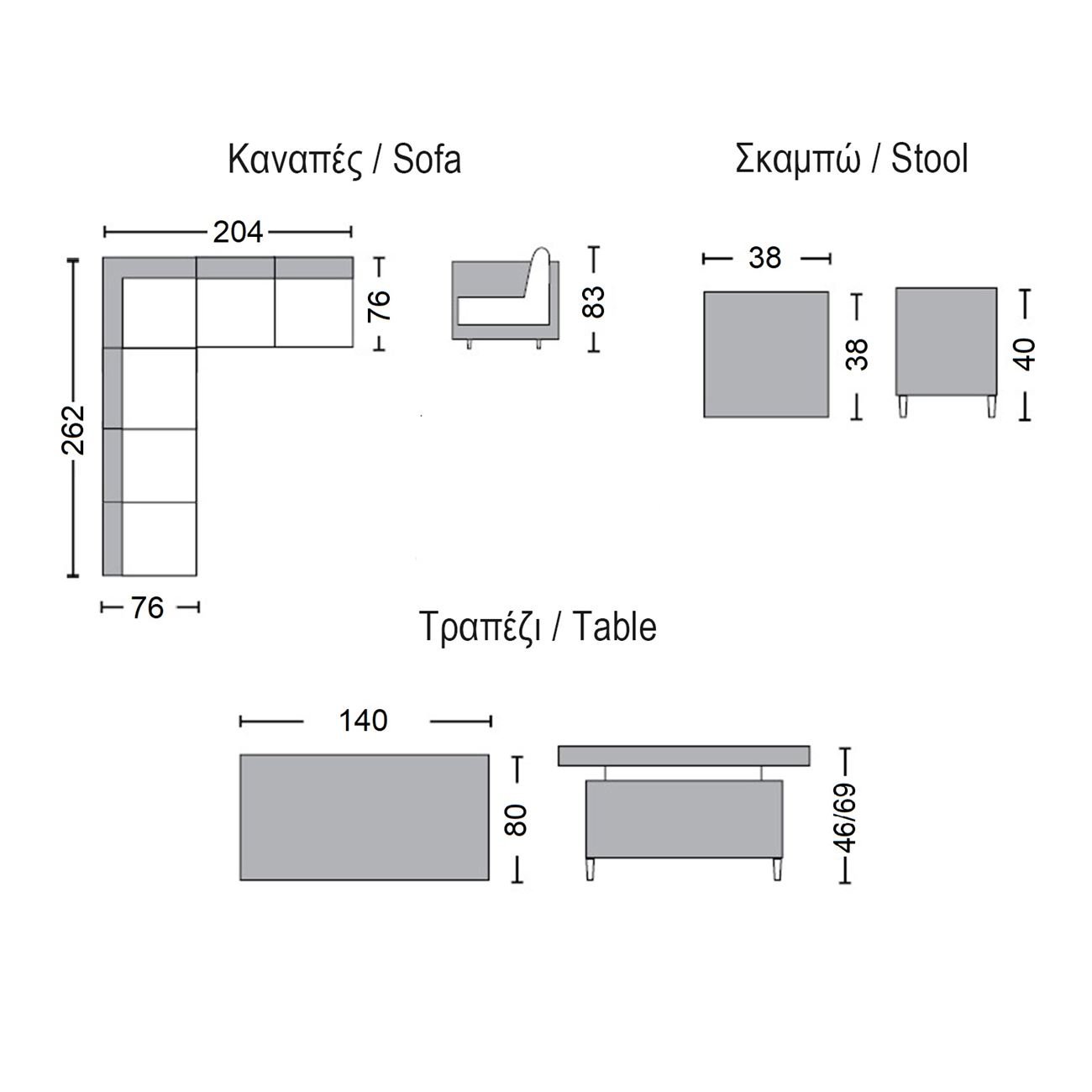 1τεμ 3-θέσιος καναπές: 204x76x83cm