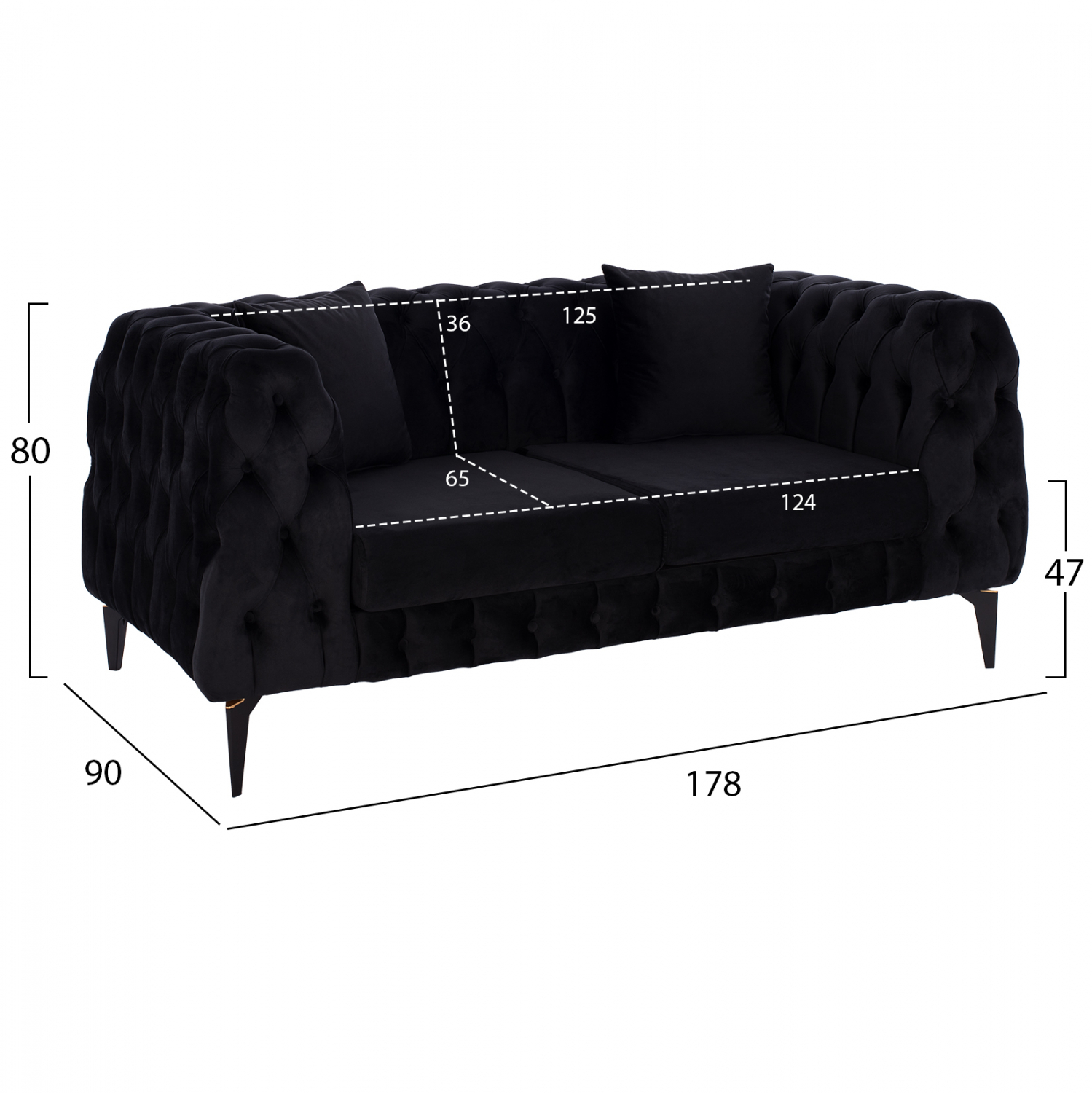 Καναπές διθέσιος Kerry από βελούδο σε μαύρο χρώμα 178x90x80 εκ.
