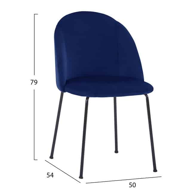 Καρέκλα CLARA επενδυμένη με βελούδο σε μπλε απόχρωση και μεταλλικά πόδια σε μαύρο ματ απόχρωση.