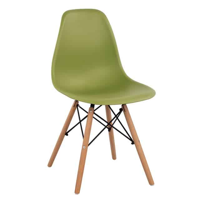 Μία μοντέρνα καρέκλα κατασκευασμένη από ξύλινο σκελετό και κάθισμα πολυπροπυλενίου σε λαχανί απόχρωση.
