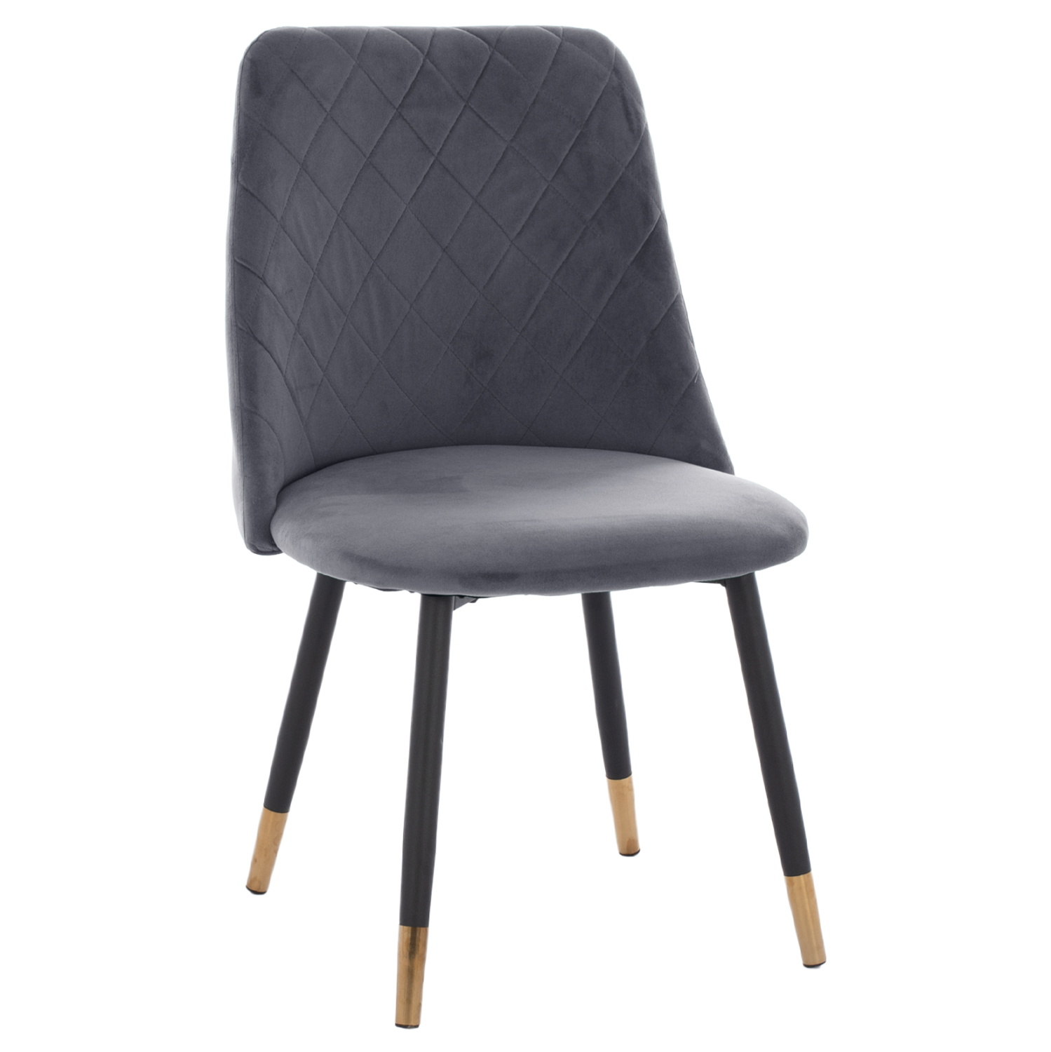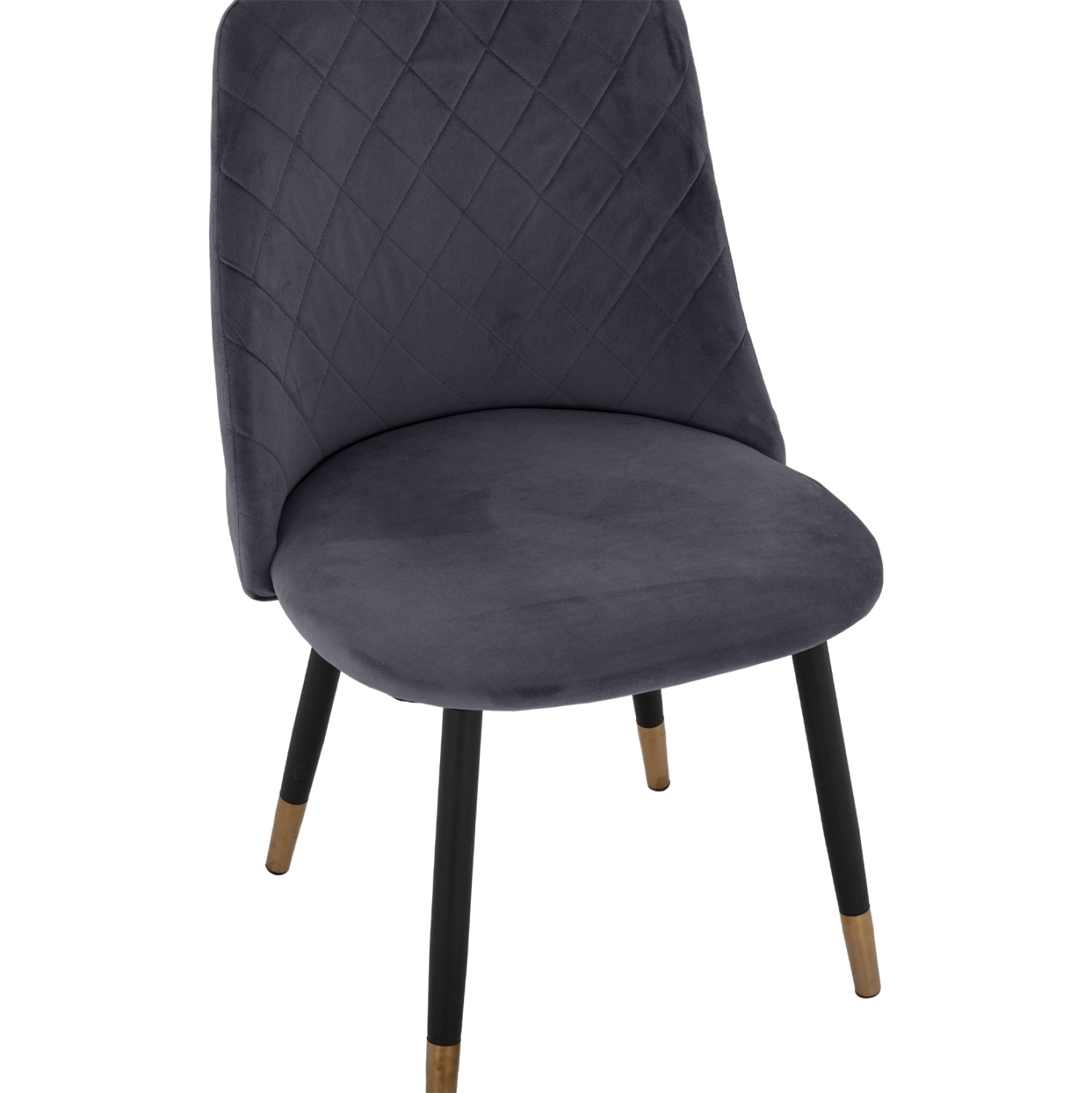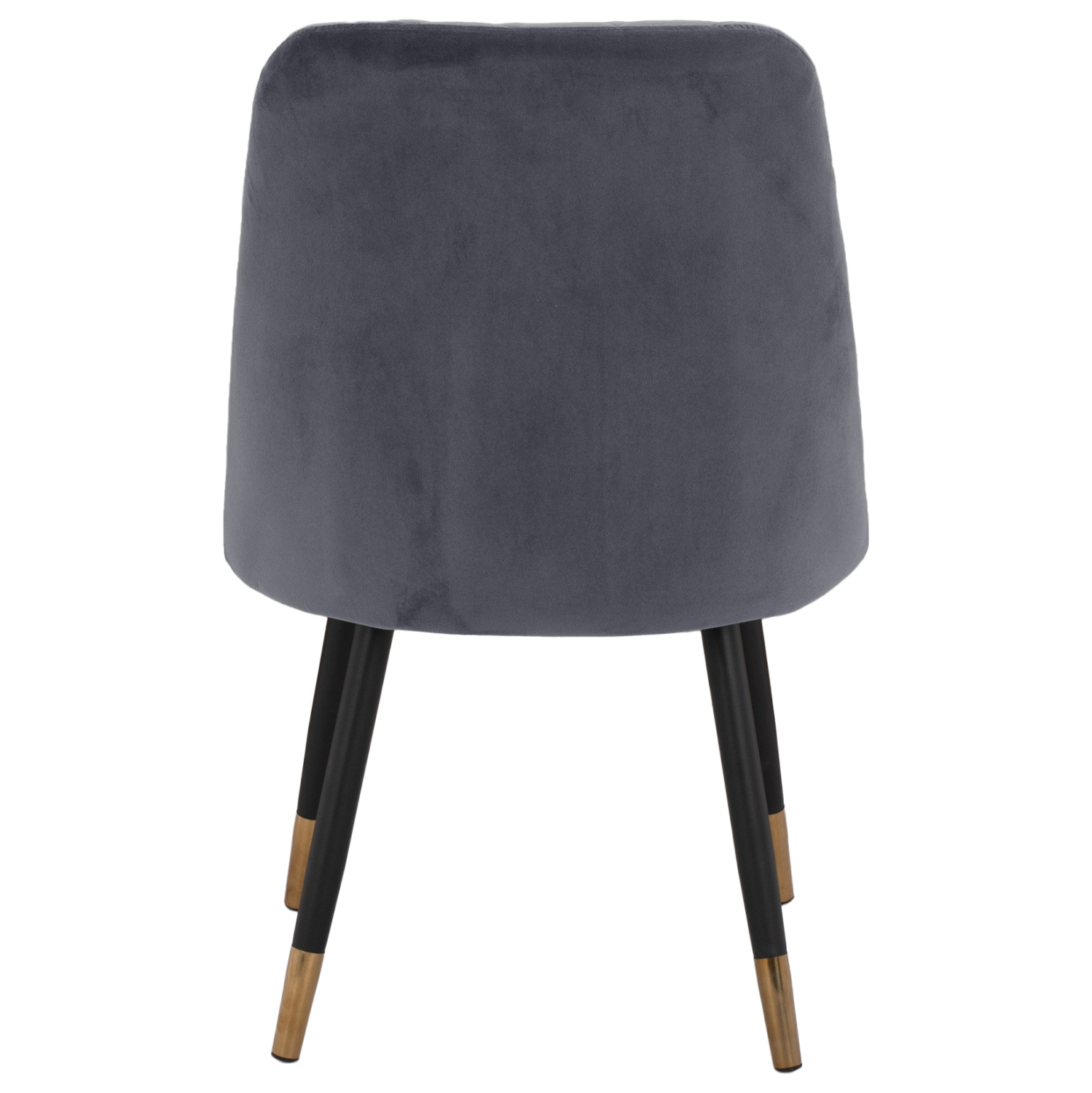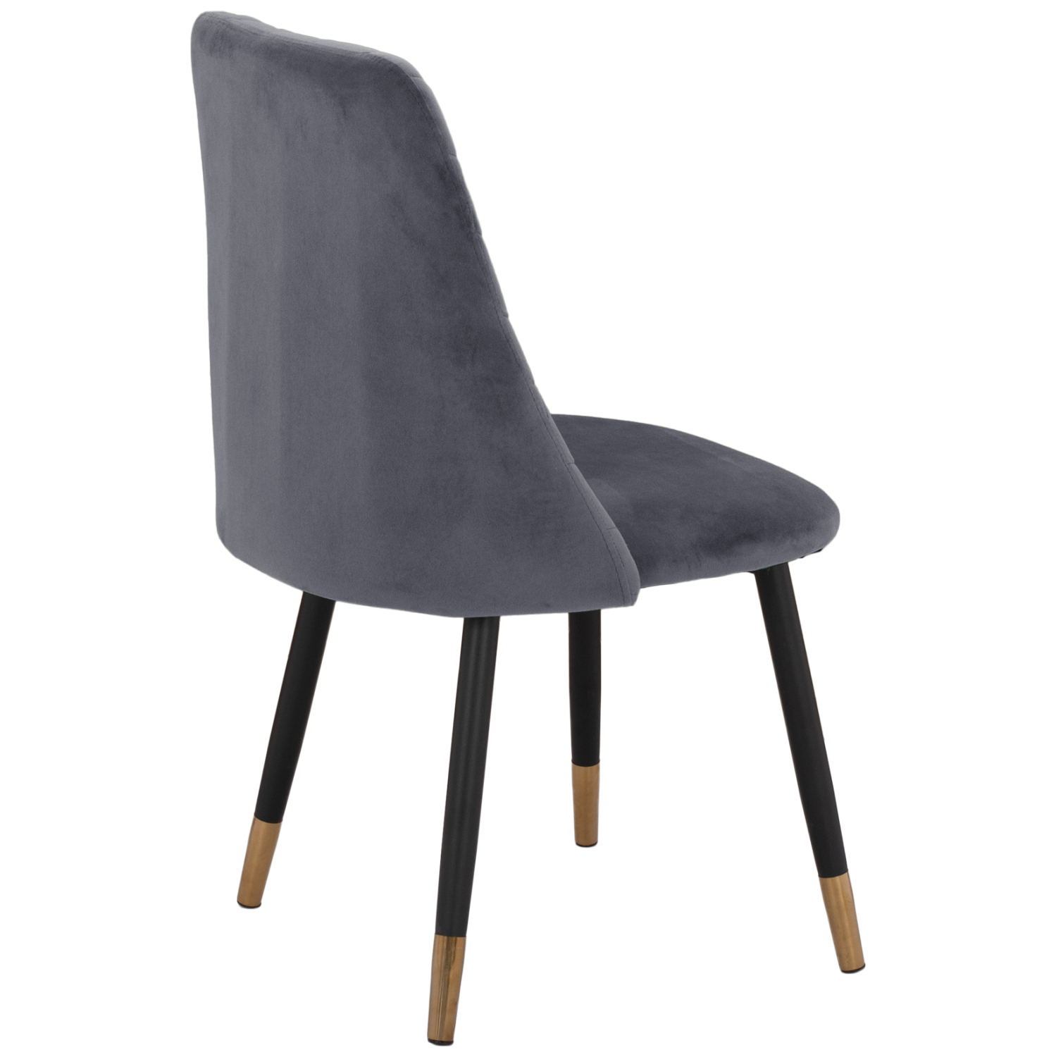 Καρέκλα SHAILY σε γκρί απόχρωση με μαύρα πόδια και κυκλικό κάθισμα. Το κάτω μέρος των ποδιών της καρέκλας είναι χρωματισμένο σε χρυσή απόχρωση προσφέροντας μια καλαίσθητη οπτική. Μια καρέκλα που δίνει αέρα πολυτέλειας σε οποιοδήποτε επαγγελματικό χώρο. Λιτή, ποιοτική και κομψή σίγουρα θα τραβήξει τα βλέμματα. Το εσωτερικό της πλάτης φέρει καπιτονέ τεχνοτροπία στην βελούδινη επένδυση, πράγμα που επιτείνει τον ιδιαίτερο χαρακτήρα αυτής της καρέκλας.