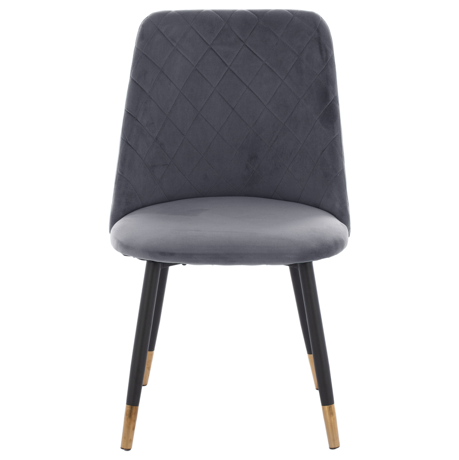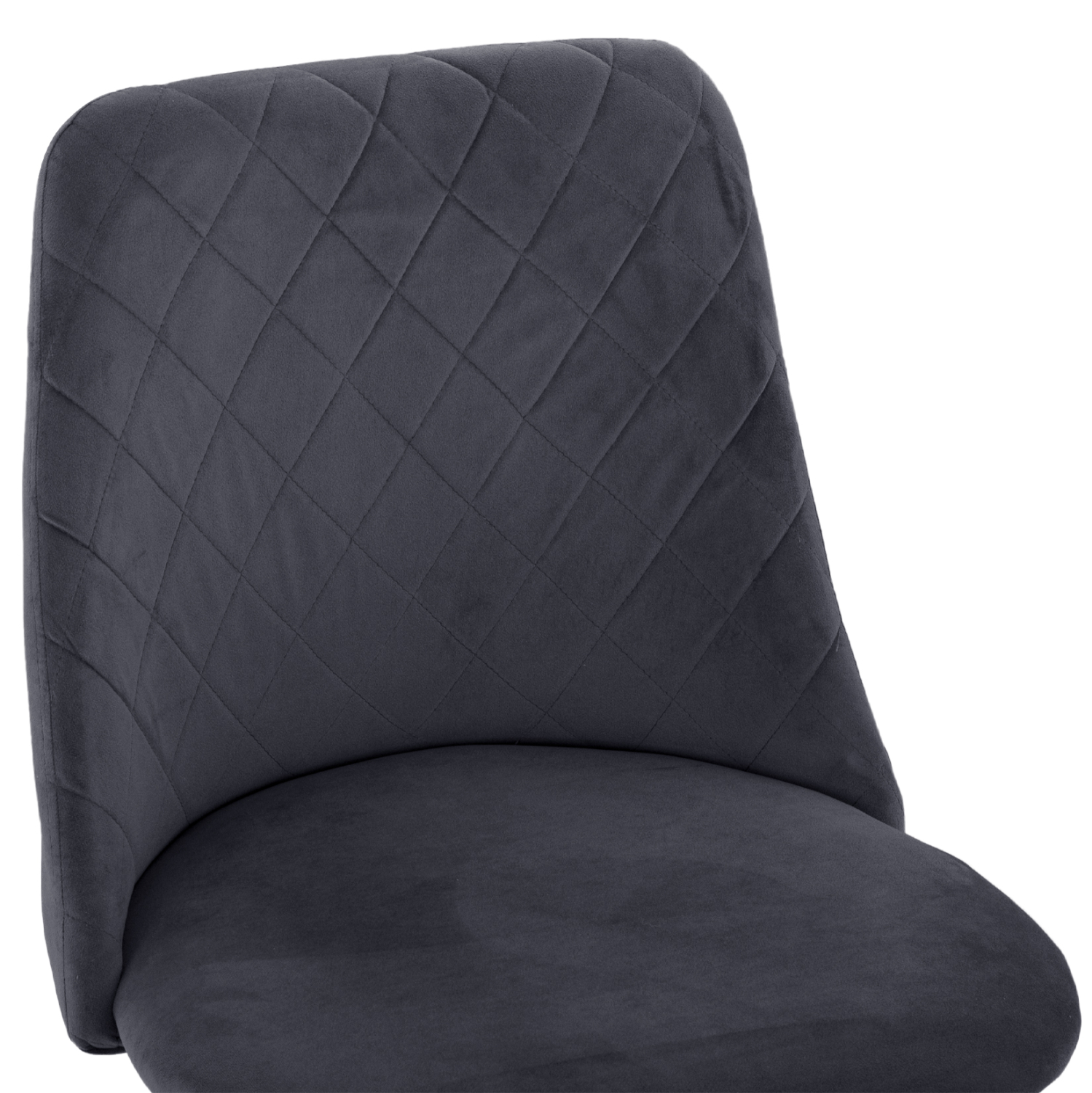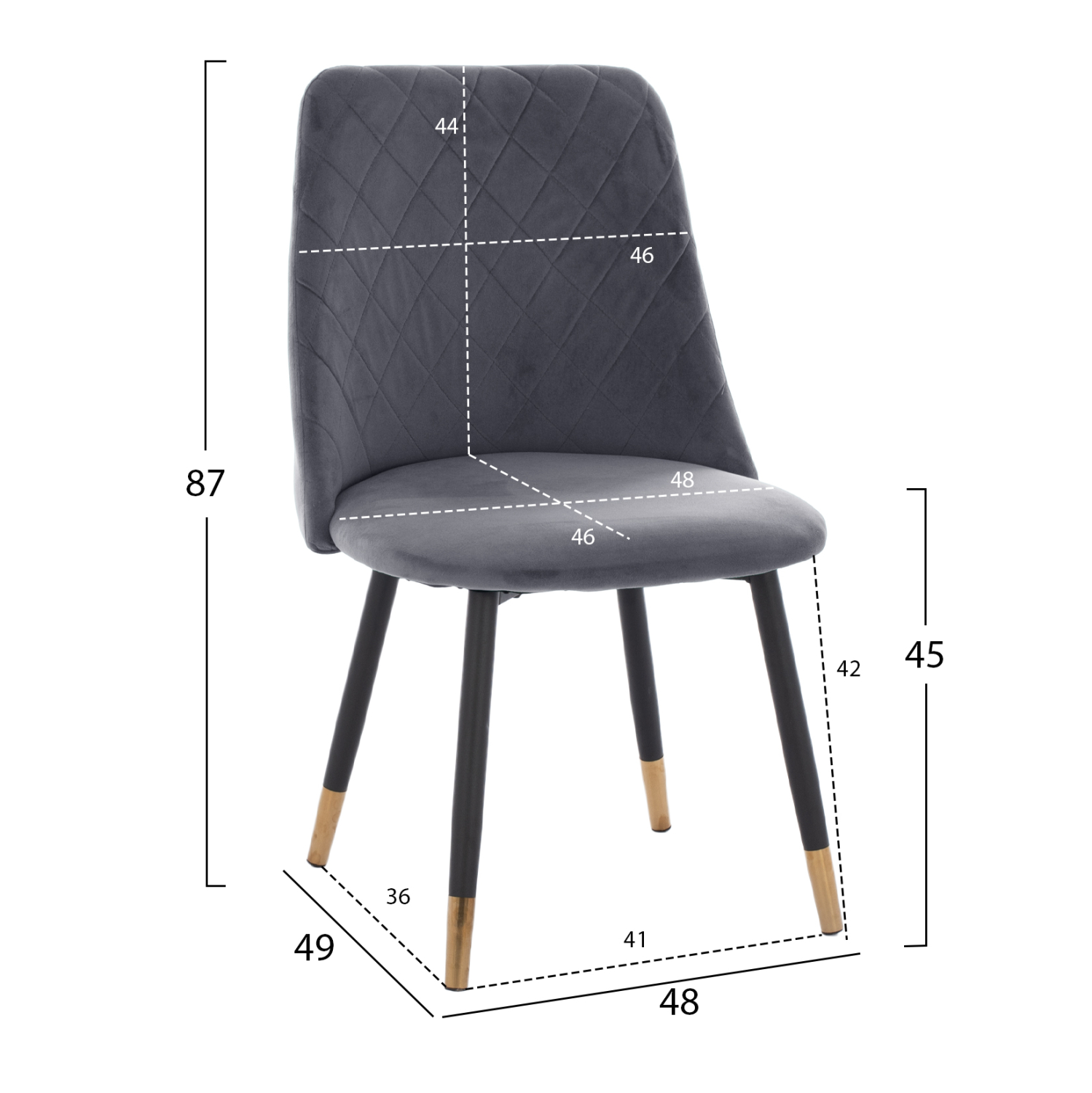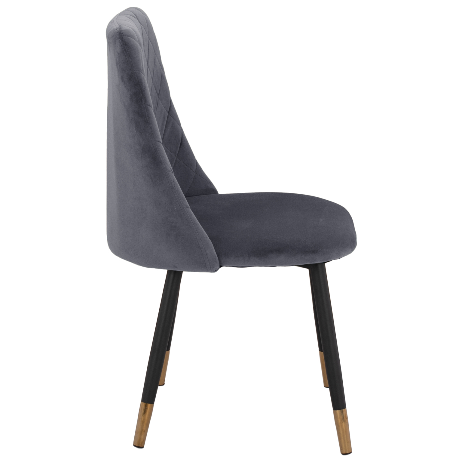 Καρέκλα SHAILY σε γκρί απόχρωση με μαύρα πόδια και κυκλικό κάθισμα. Το κάτω μέρος των ποδιών της καρέκλας είναι χρωματισμένο σε χρυσή απόχρωση προσφέροντας μια καλαίσθητη οπτική. Μια καρέκλα που δίνει αέρα πολυτέλειας σε οποιοδήποτε επαγγελματικό χώρο. Λιτή, ποιοτική και κομψή σίγουρα θα τραβήξει τα βλέμματα. Το εσωτερικό της πλάτης φέρει καπιτονέ τεχνοτροπία στην βελούδινη επένδυση, πράγμα που επιτείνει τον ιδιαίτερο χαρακτήρα αυτής της καρέκλας.