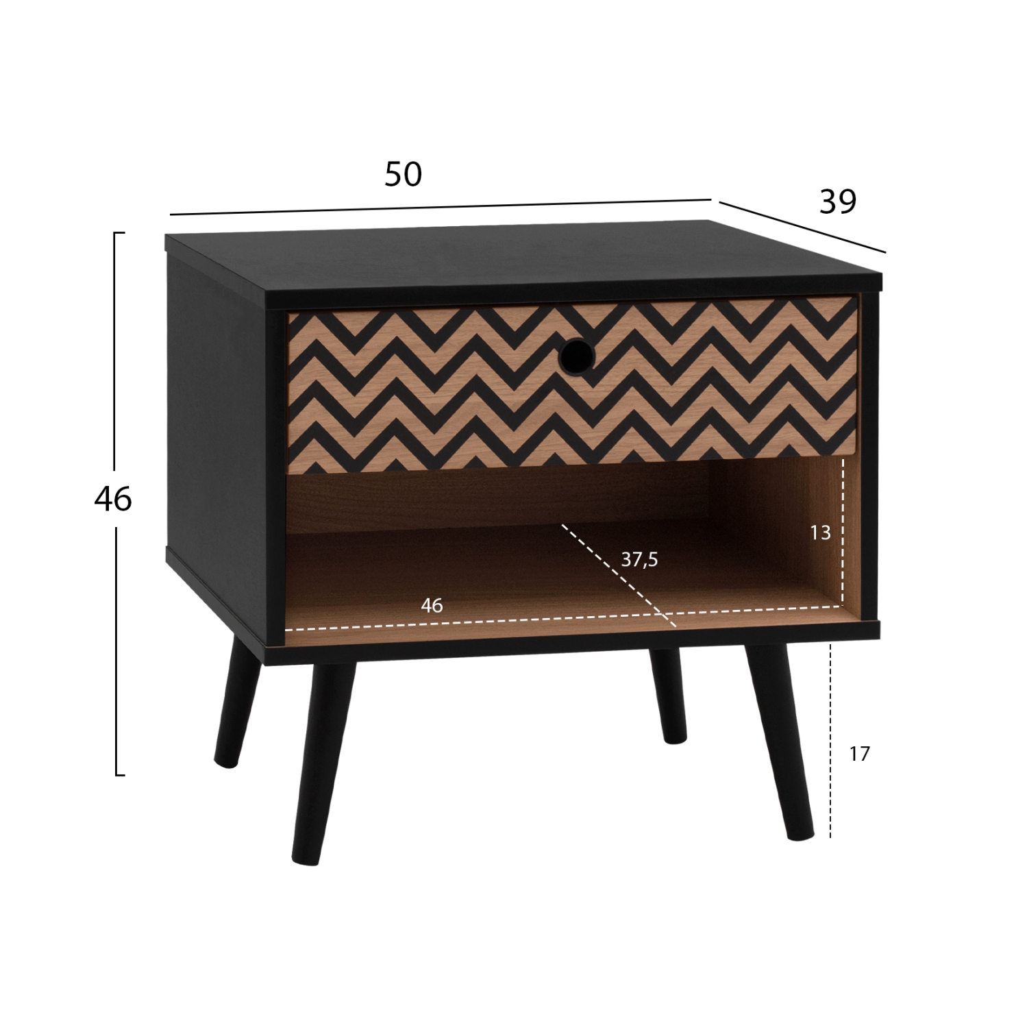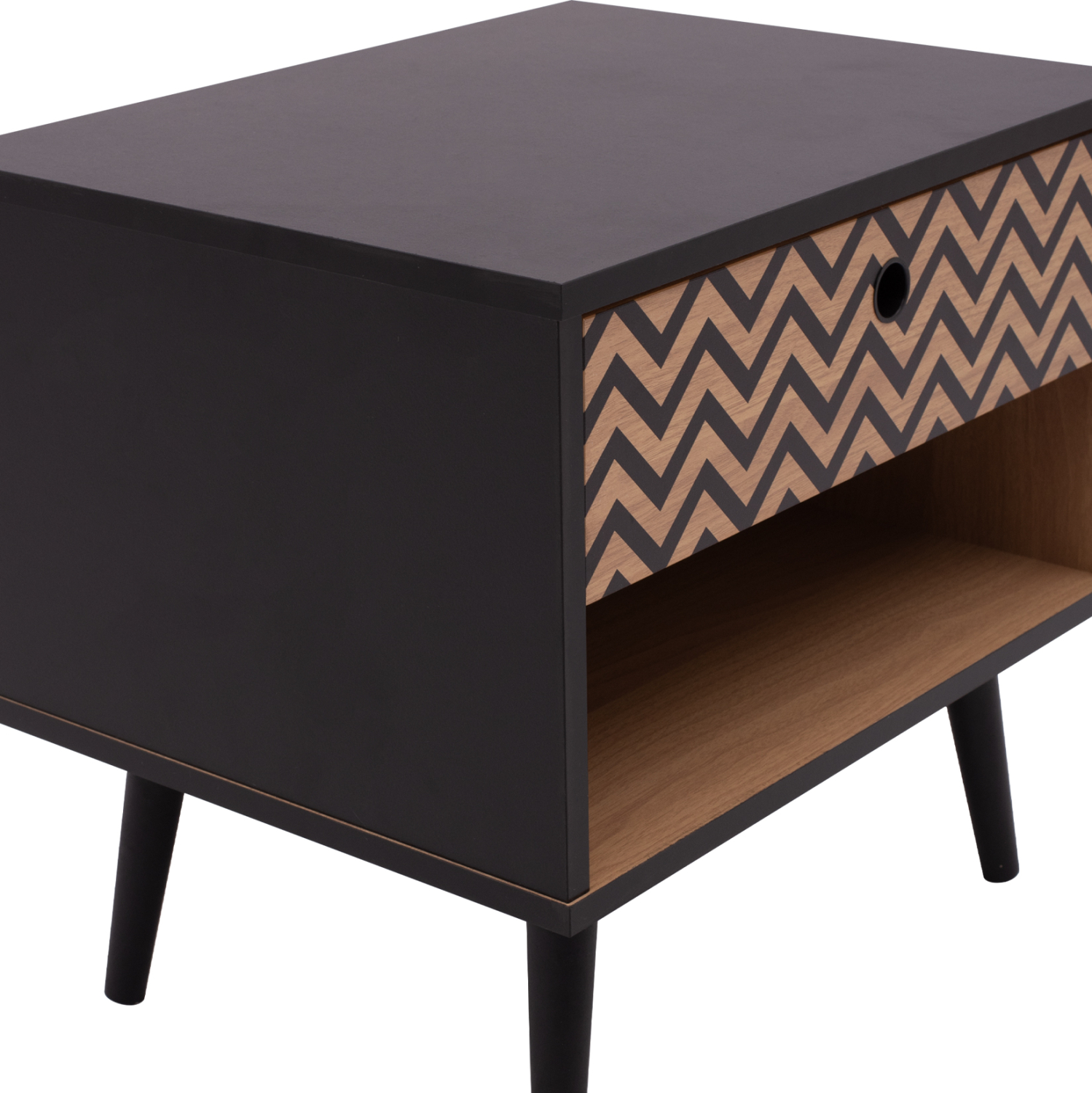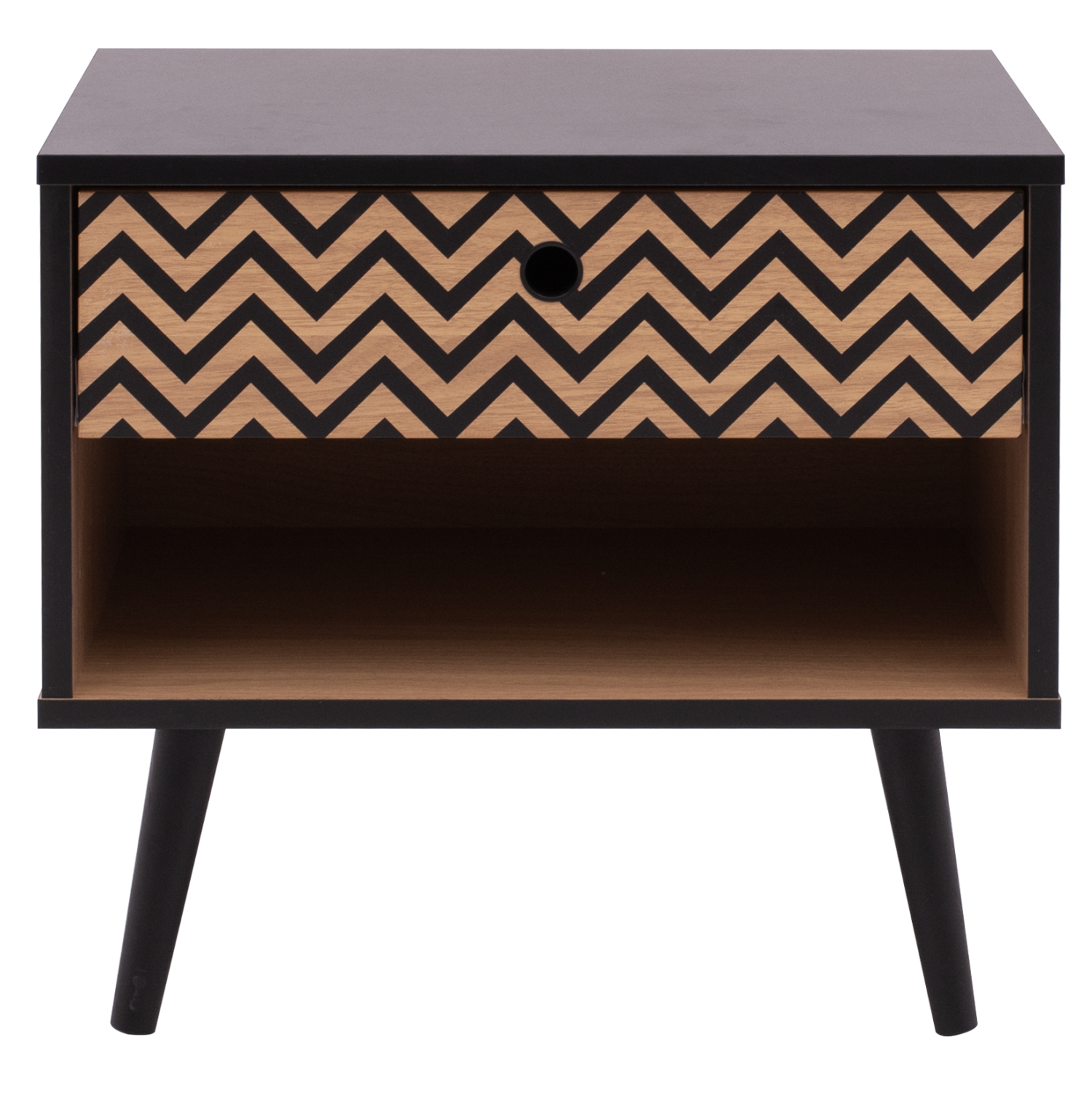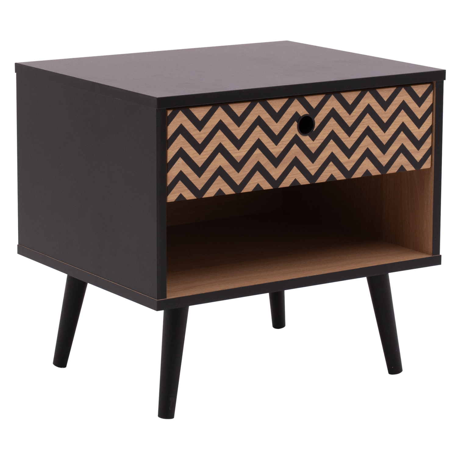 Μοντέρνο κομοδίνο από τη σειρά CHARLEEN, κατασκευασμένο από μελαμίνη σε φυσική απόχρωση, με μαύρες λεπτομέρειες.