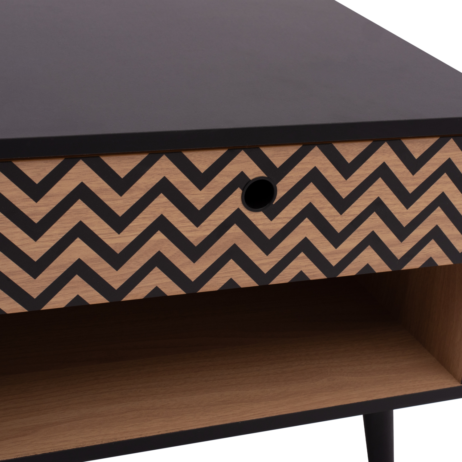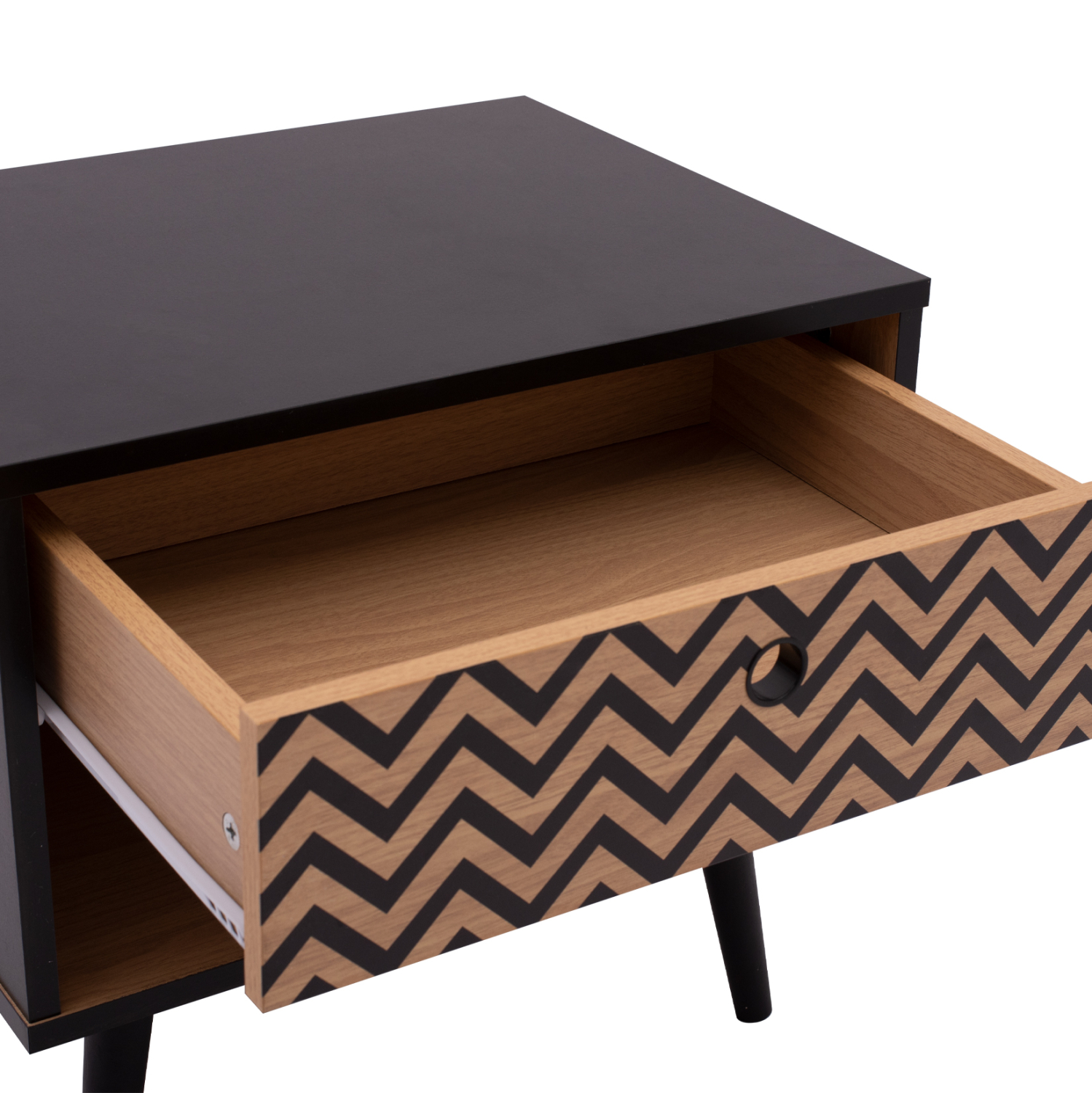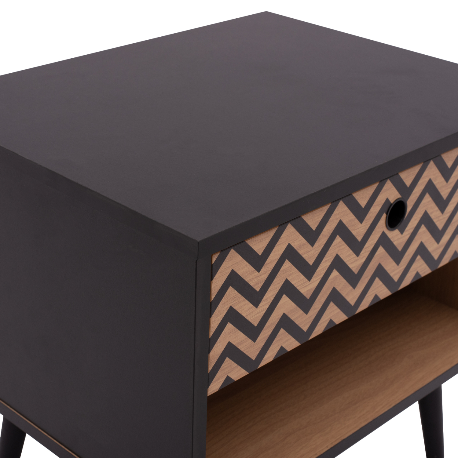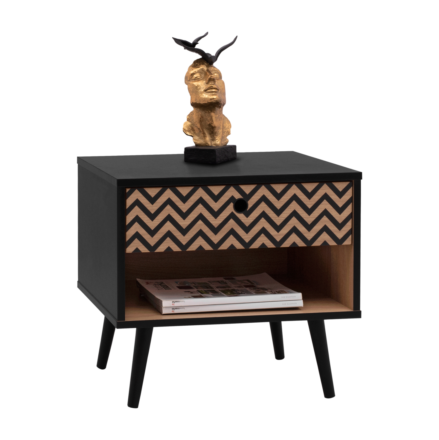 Μοντέρνο κομοδίνο από τη σειρά CHARLEEN, κατασκευασμένο από μελαμίνη σε φυσική απόχρωση, με μαύρες λεπτομέρειες.