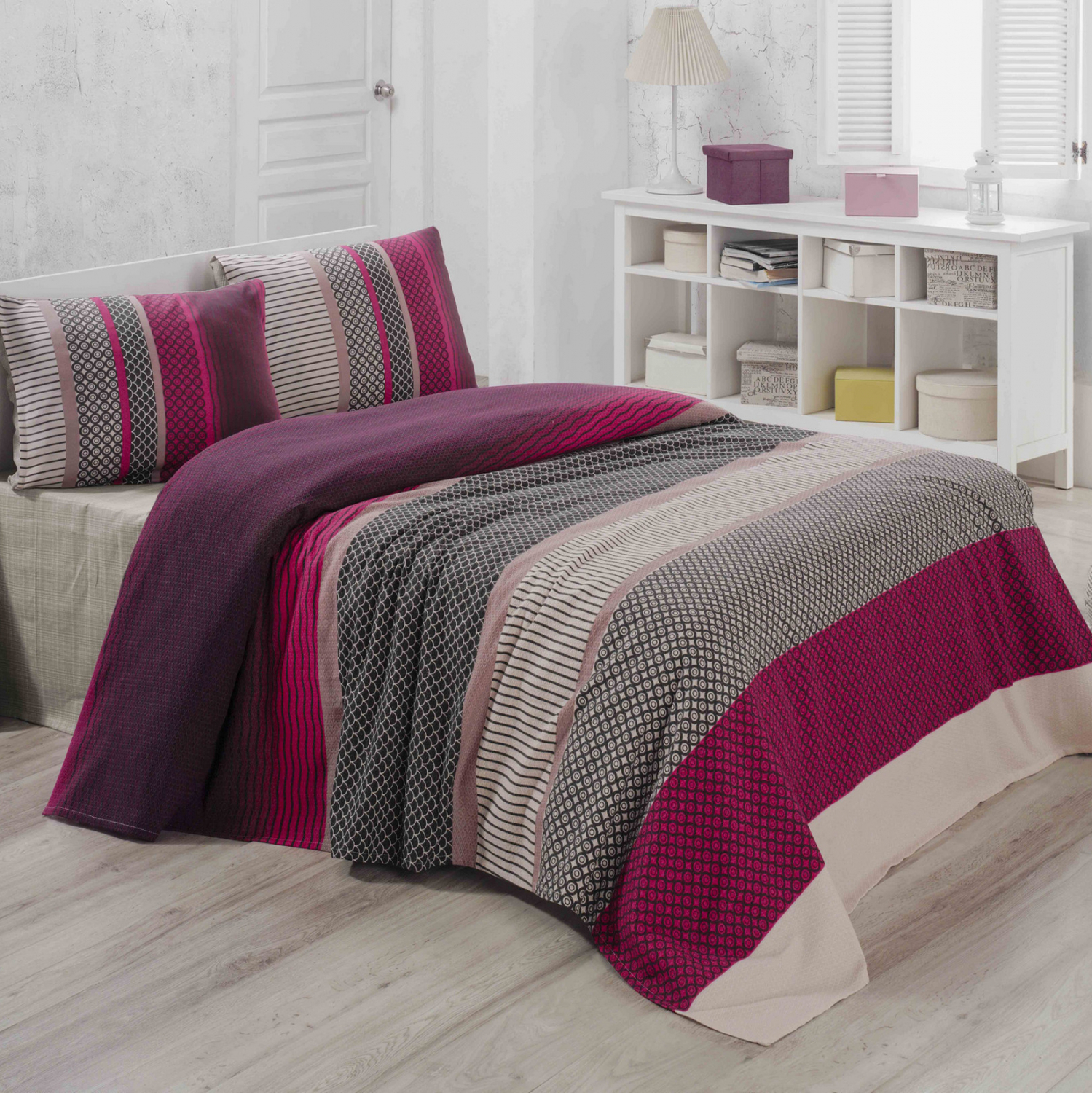 Πρόκειται για μια κουβέρτα άριστης ποιότητας, κατασκευασμένη από 100% βαμβάκι, σε φούξια και λευκή απόχρωση με γεωμετρικό pattern.