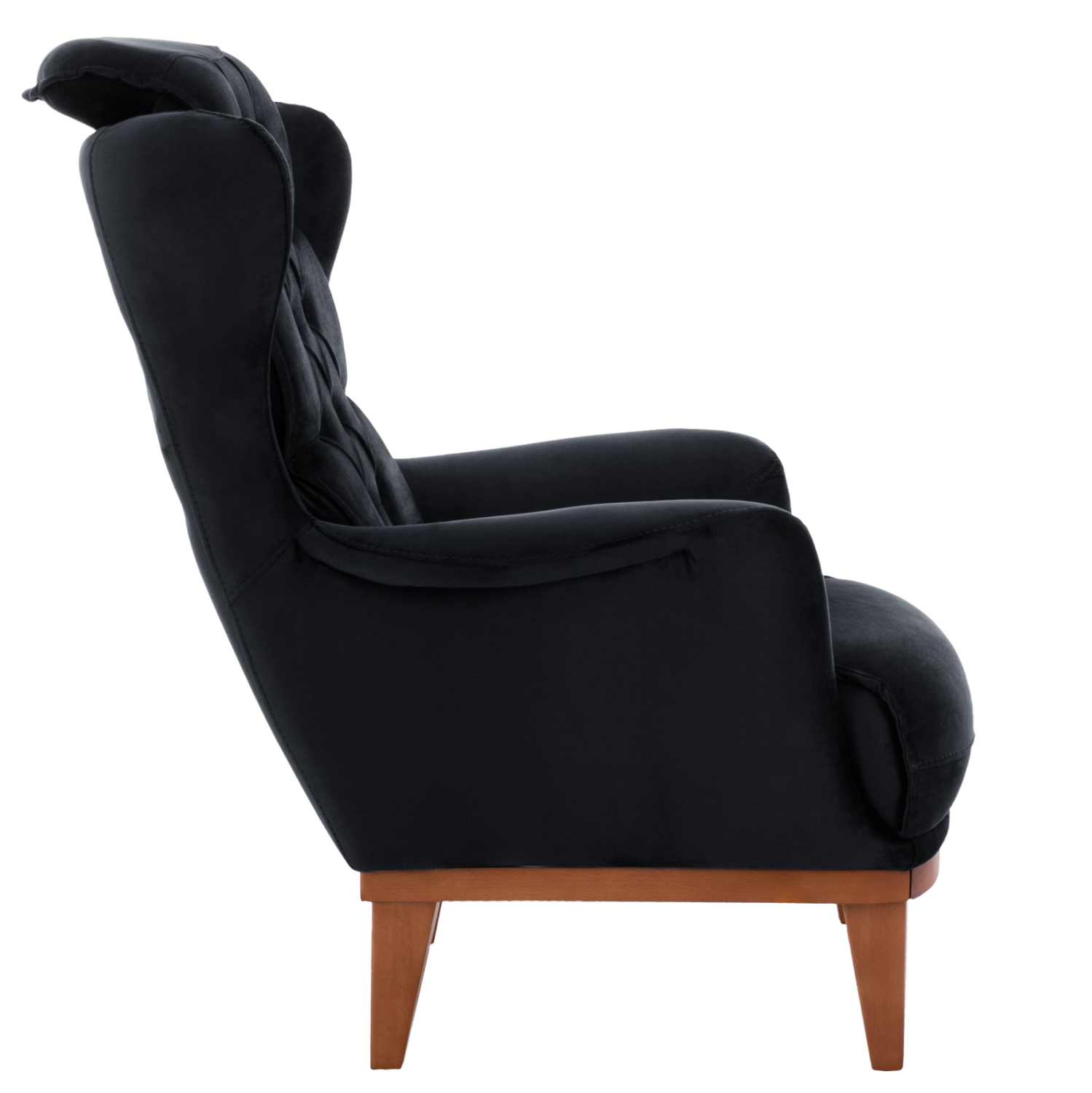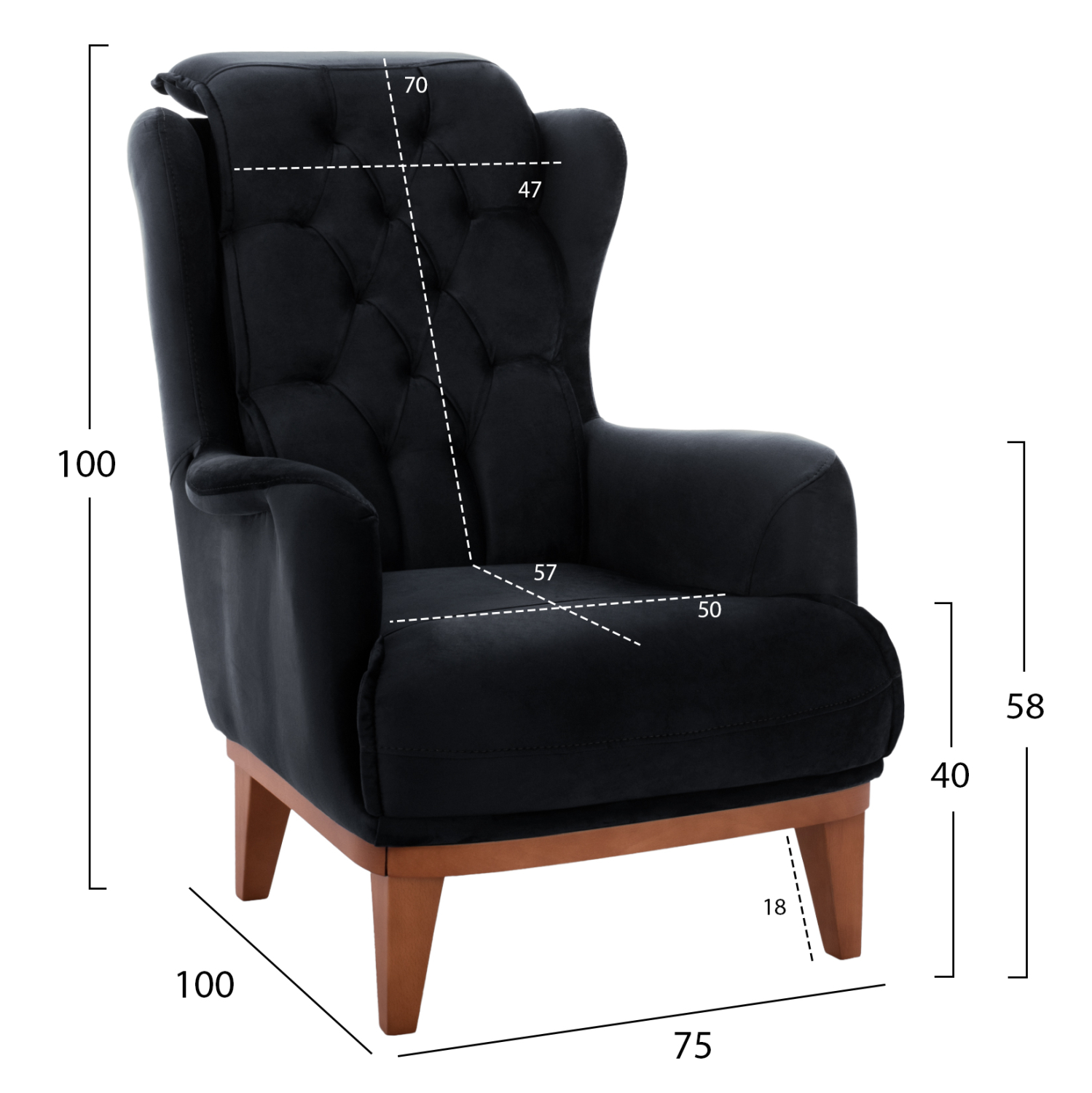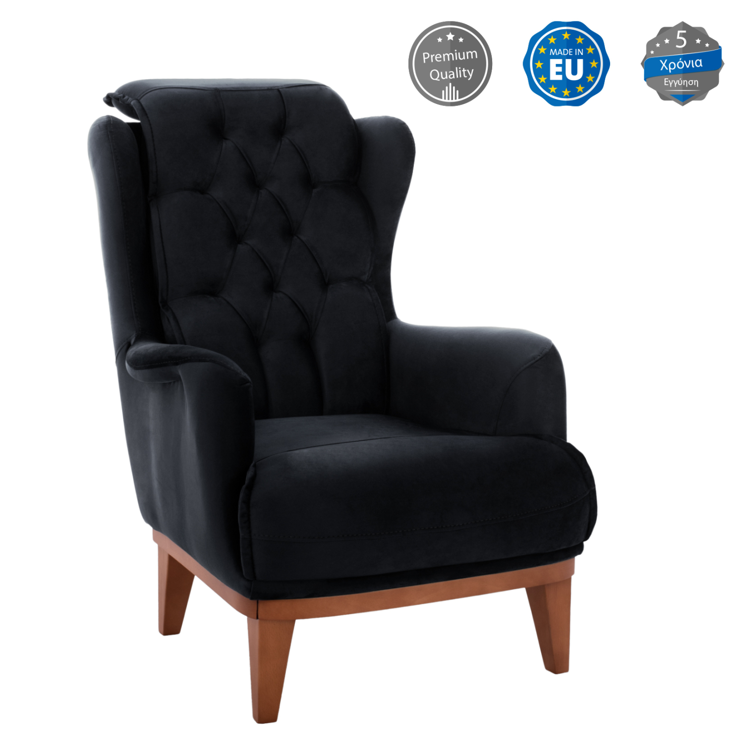Σας παρουσιάζουμε την μπερζέρα BENNINGTON, σε ΜΑΥΡΟ χρώμα με ξύλινα πόδια σε φυσική απόχρωση. Η επένδυση της πλάτης έχει γίνει με τεχνοτροπία καπιτονέ που προσδίδει ιδιαίτερη ομορφιά στην μπερζέρα σε συνδυασμό, φυσικά, με την βελούδινη επένδυση.