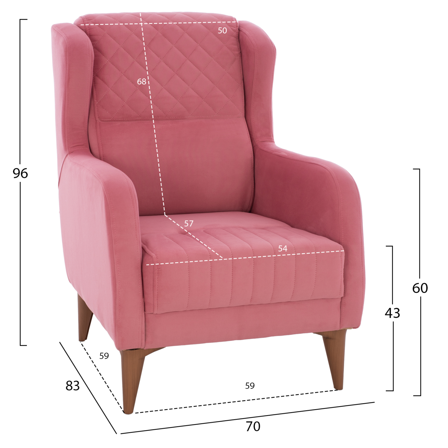 Ολόκληρη η επένδυση της μπερζέρας έχει γίνει με εξαιρετικής ποιότητας βελούδινο ύφασμα, χαρίζοντας ελκυστική όψη και μια εκλεπτυσμένη γοητεία στην διακόσμηση του σαλονιού σας. Το βελούδο είναι το ύφασμα που δεν μπορεί να αφήσει κανέναν ασυγκίνητο! Είτε καλύπτει μικρές είτε μεγάλες επιφάνειες, δεν μπορεί παρά να κάνει την παρουσία του αισθητή στο χώρο και να μαγνητίσει τα βλέμματα. Το βελούδο είναι ένα ύφασμα που αγαπήθηκε ιδιαιτέρως από τους βασιλείς και τους αυτοκράτορες των περασμένων αιώνων, με αποτέλεσμα να γίνει συνώνυμο της πολυτέλειας και της αίγλης. Έχει κατακλύσει τις βιτρίνες των μεγαλύτερων καταστημάτων και αποτελεί μία από τις πιο αγαπημένες επιλογές των πιο επώνυμων διακοσμητών παγκοσμίως. Πρόκειται για ένα ύφασμα απαλό, χαλαρό, απολαυστικό και φινετσάτο που είναι αδύνατον να του αντισταθεί κάποιος. Το θετικό είναι ότι μπορεί να εναρμονιστεί εύκολα με κάθε είδος διακόσμησης, προσδίδοντας στο χώρο φινέτσα και καλαισθησία.