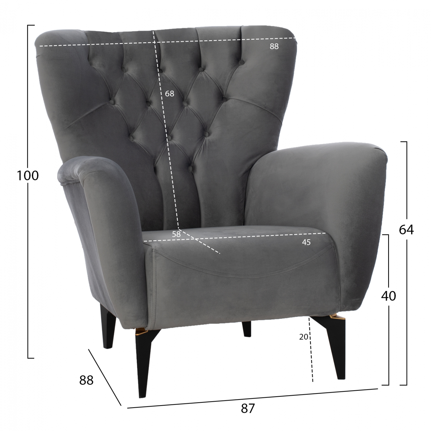 Πολυθρόνα μπερζέρα τύπου Chesterfield από βελούδο σε γκρι 87x88x100 εκ.