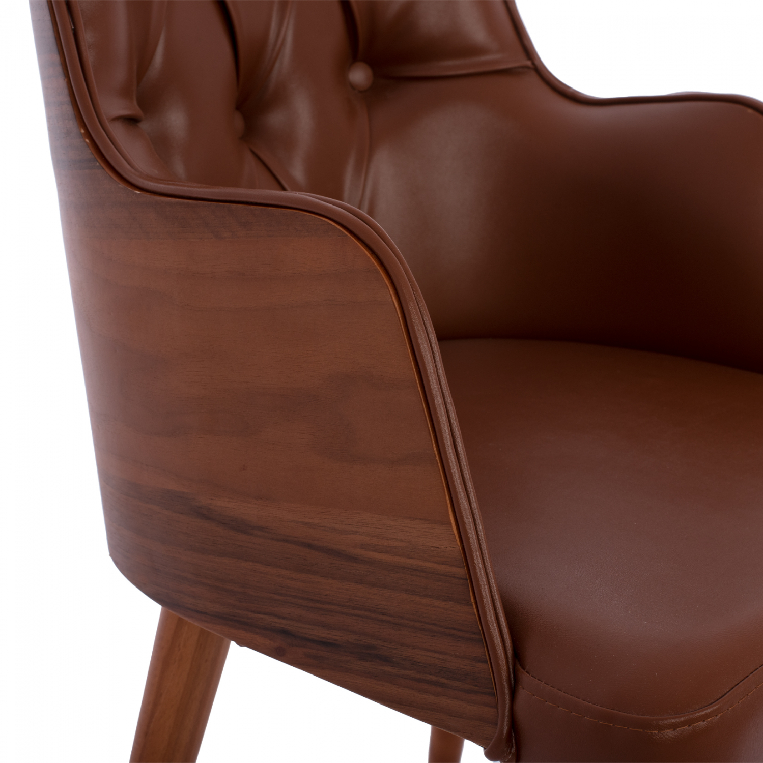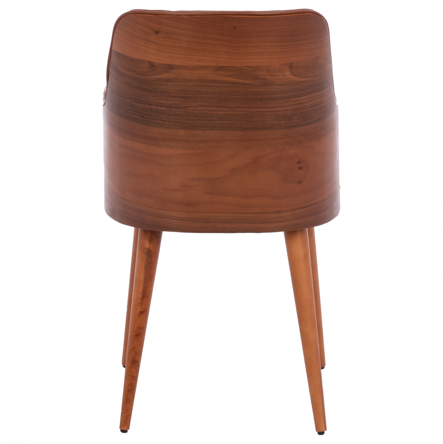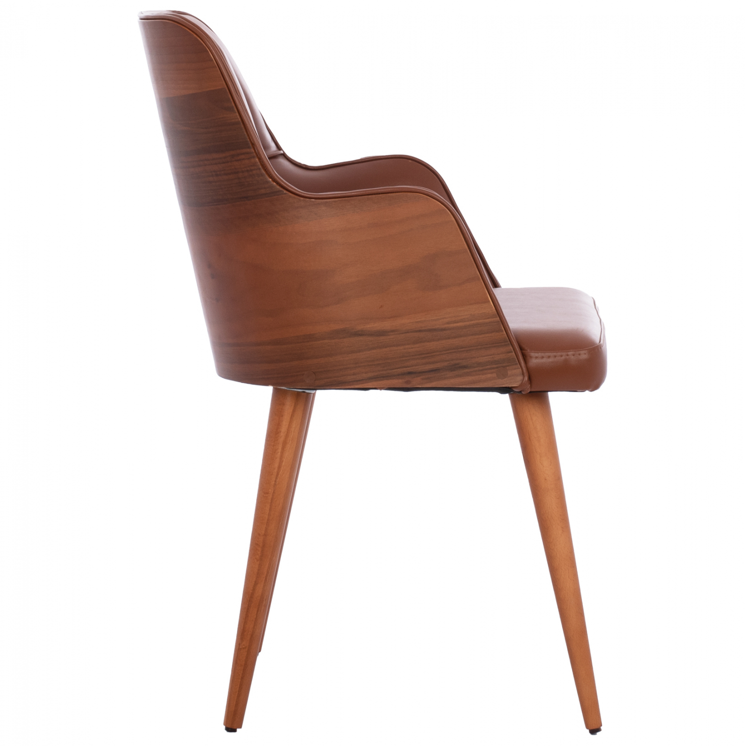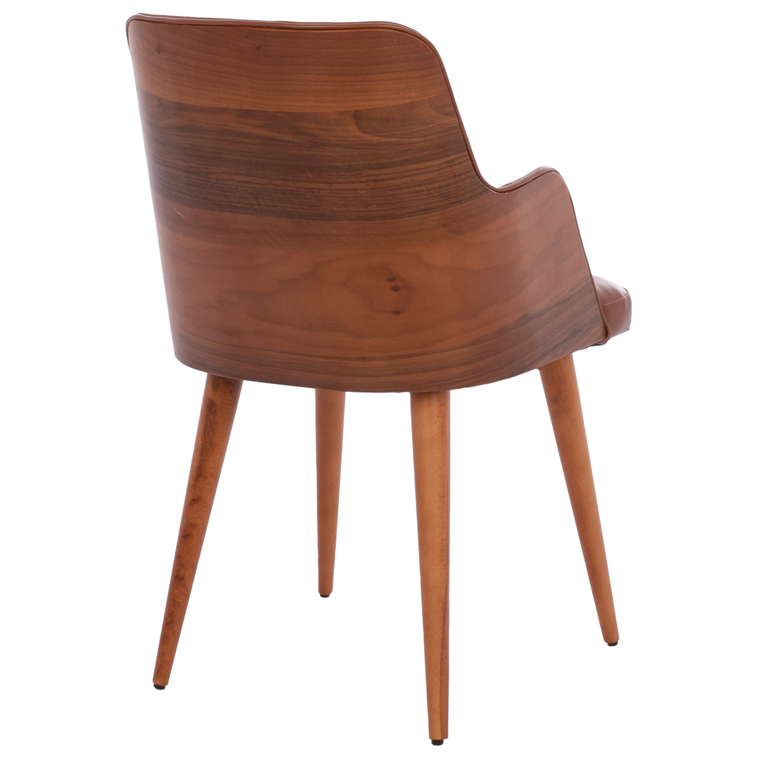 Πολυθρόνα ESTRELLA σε ταμπά απόχρωση με ξύλινη πλάτη, και ξύλινα πόδια σε καρυδί απόχρωση. Η ξύλινη πλάτη είναι συμπαγής και το ξύλο φτάνει κυρτά και συνεχόμενα μέχρι τα μισά του καθίσματος σχηματίζοντας τα μπράτσα της καρέκλας.