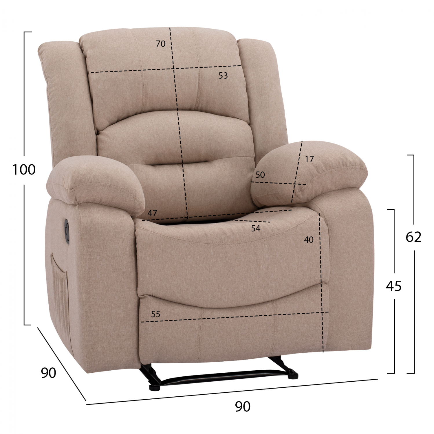 Πολυθρόνα relax με ανάκληση και μηχανισμό μασάζ, επενδυμένη με ύφασμα σε μπεζ απόχρωση.
