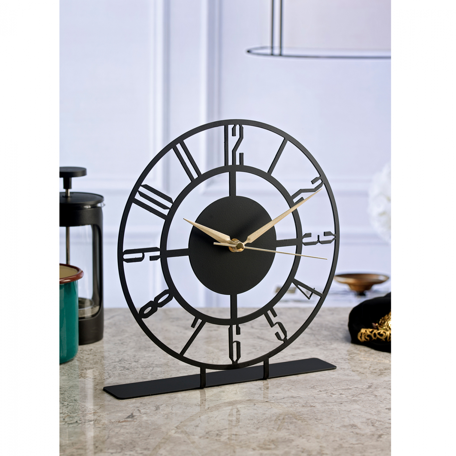 Ρολόι επιτραπέζιο σε μαύρη απόχρωση με χρυσές λεπτομέρειες στους δείκτες.