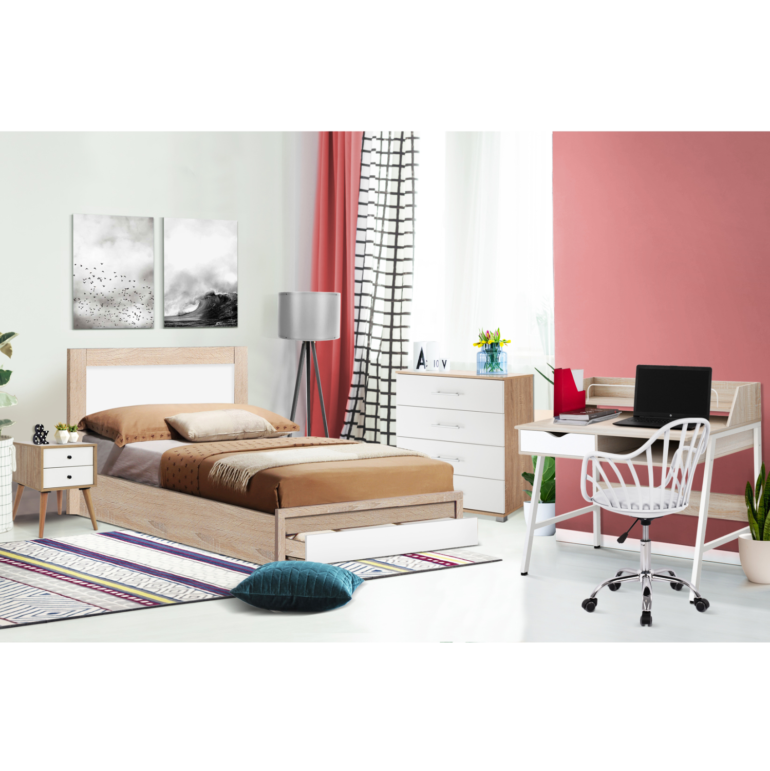 Αυτό το σετ περιλαμβάνει συρταριέρα, κομοδίνο, γραφείο, στρώμα κρεβατιού, κρεβάτι μονό, και καρέκλα γραφείου!