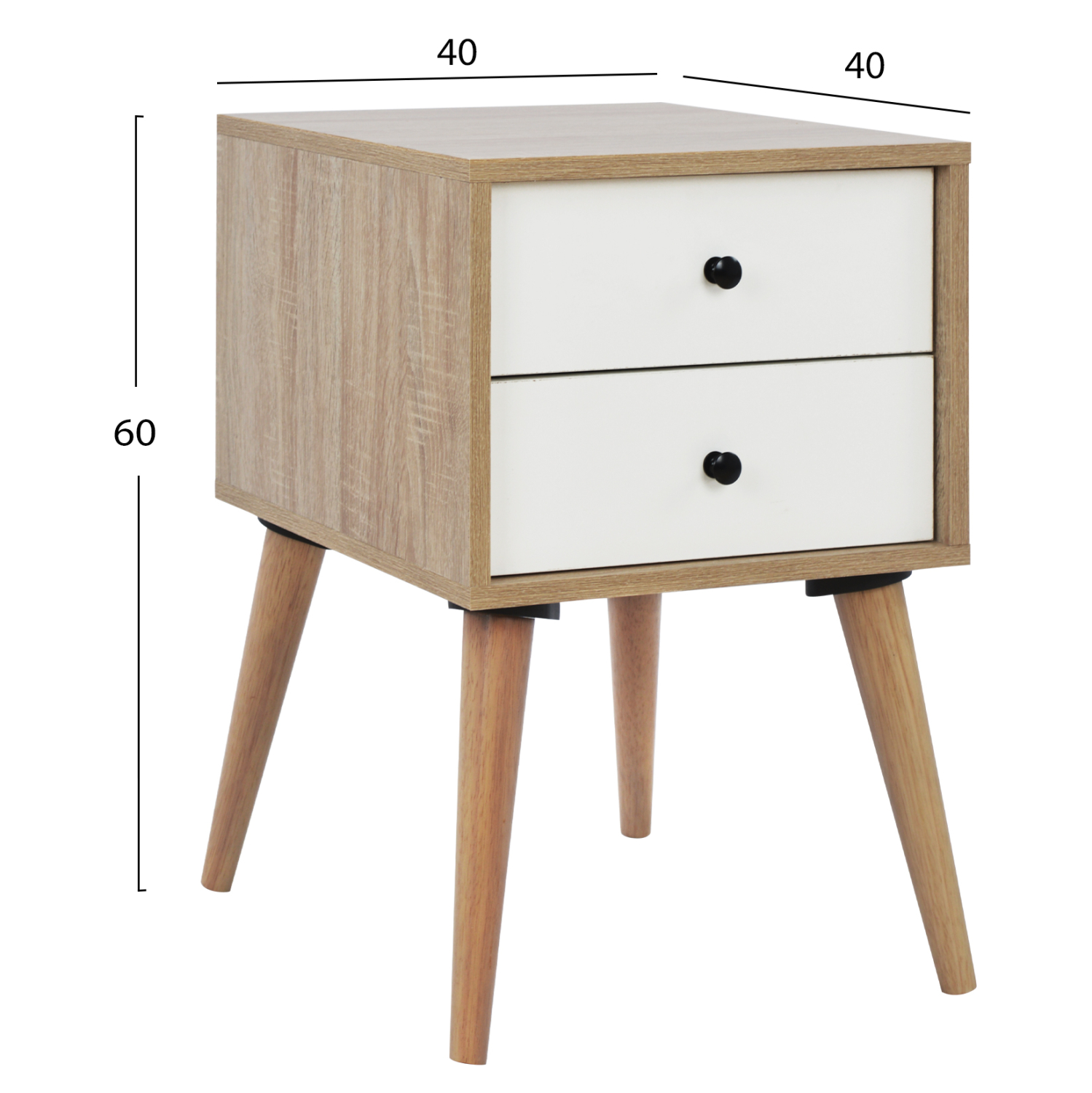 Κομοδινάκι από μελαμίνη σε Sonoma χρώμα, με 2 συρτάρια σε λευκό χρώμα και ψηλά πόδια. Διαστάσεις: 40Χ40Χ60 εκ.