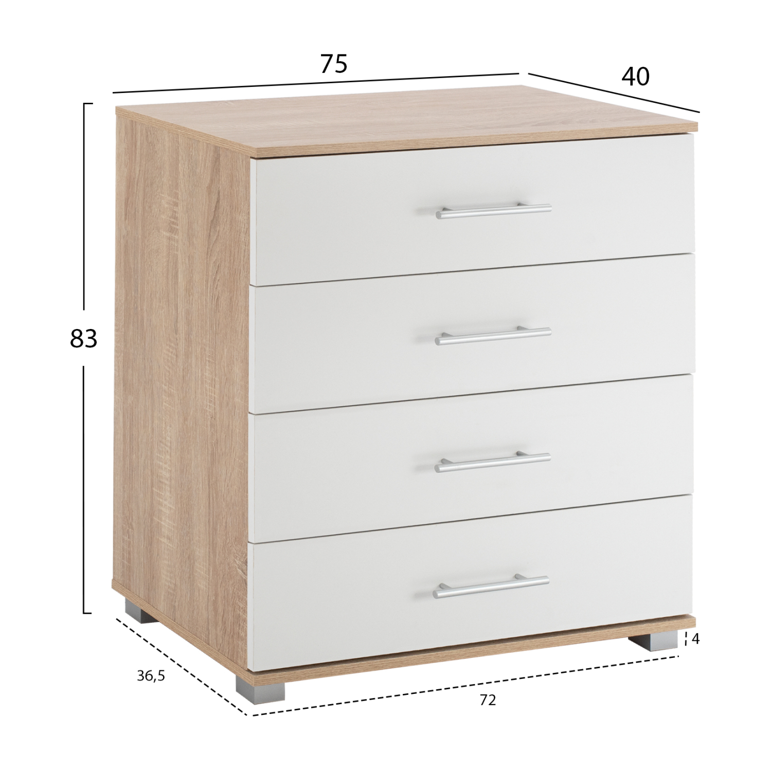 Συρταριέρα από μελαμίνη σε χρώμα Sonoma με 4 λευκά συρτάρια και σταθερά πόδια. Διαστάσεις: 75x40x83Y εκ.