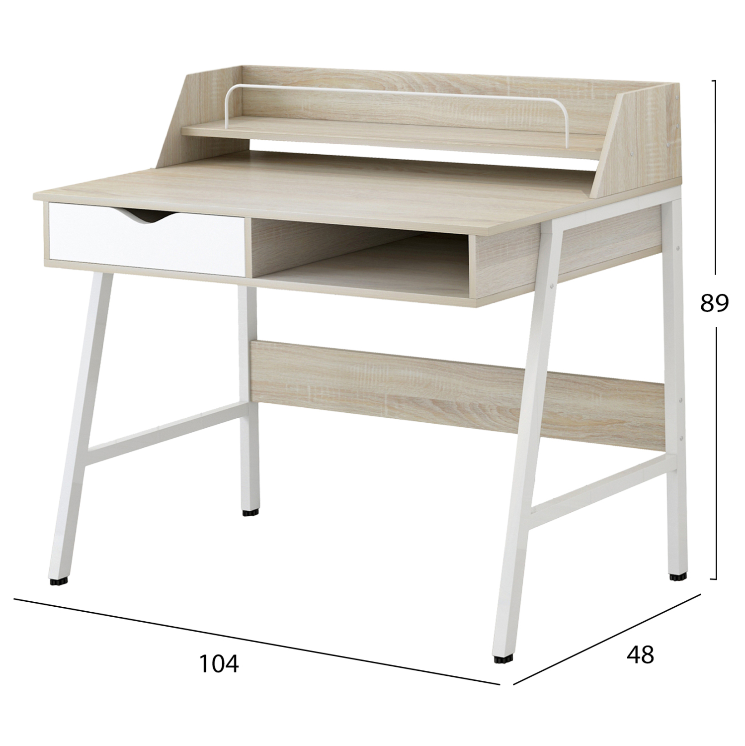 Γραφείο με ράφι, συρτάρι και χώρο αποθήκευσης κάτω από την επιφάνεια του γραφείου. Χρώμα Sonoma με λευκό. Κατασκευασμένο από μελαμίνη και σκελετό μεταλλικό. Διαστάσεις: 104x48x89 εκ.