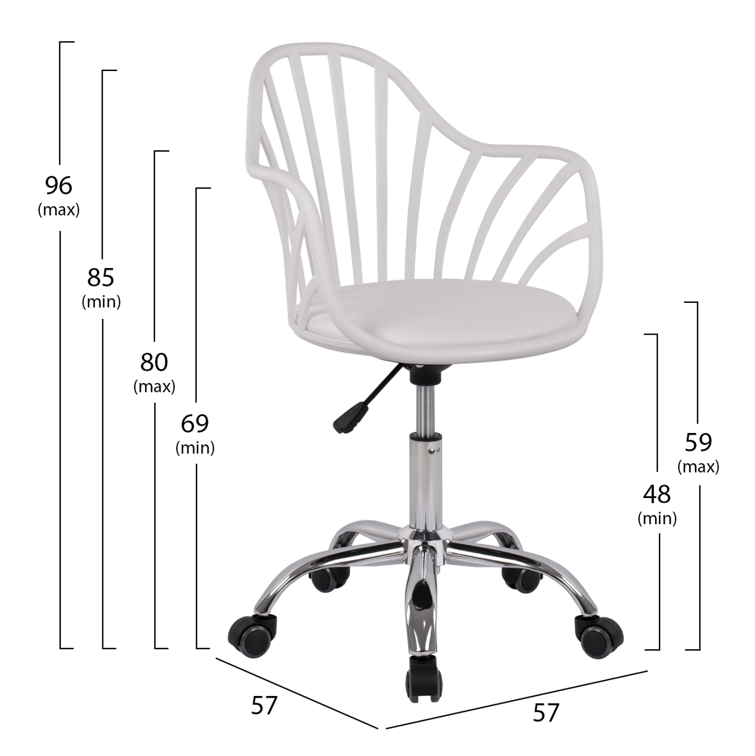 Καρέκλα γραφείου BECKY σε μοναδικό design, από πολυπροπυλένιο με χρωμιωμένη μεταλλική βάση, σε λευκό χρώμα. Διαστάσεις: 57x57x96 εκ.