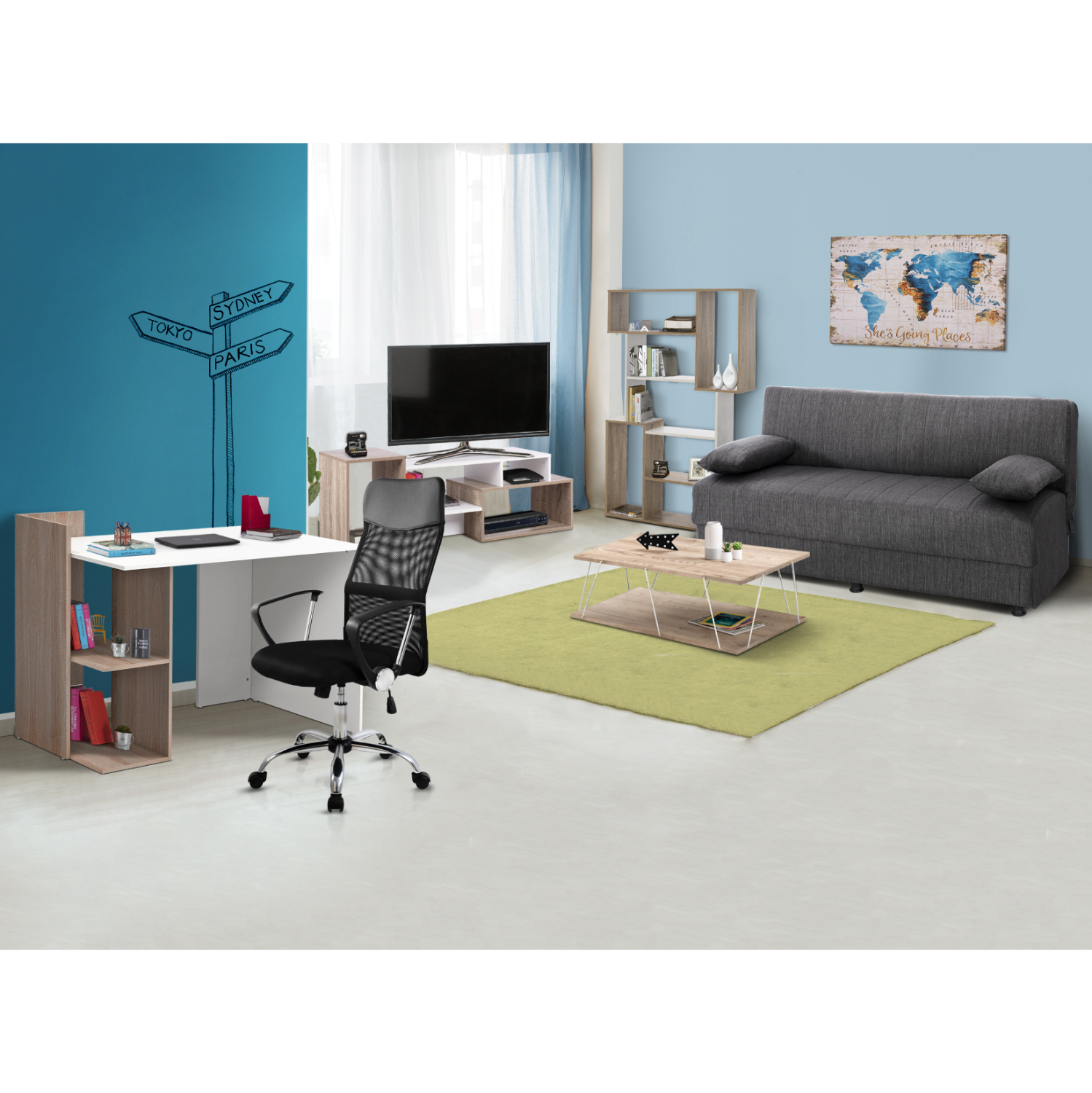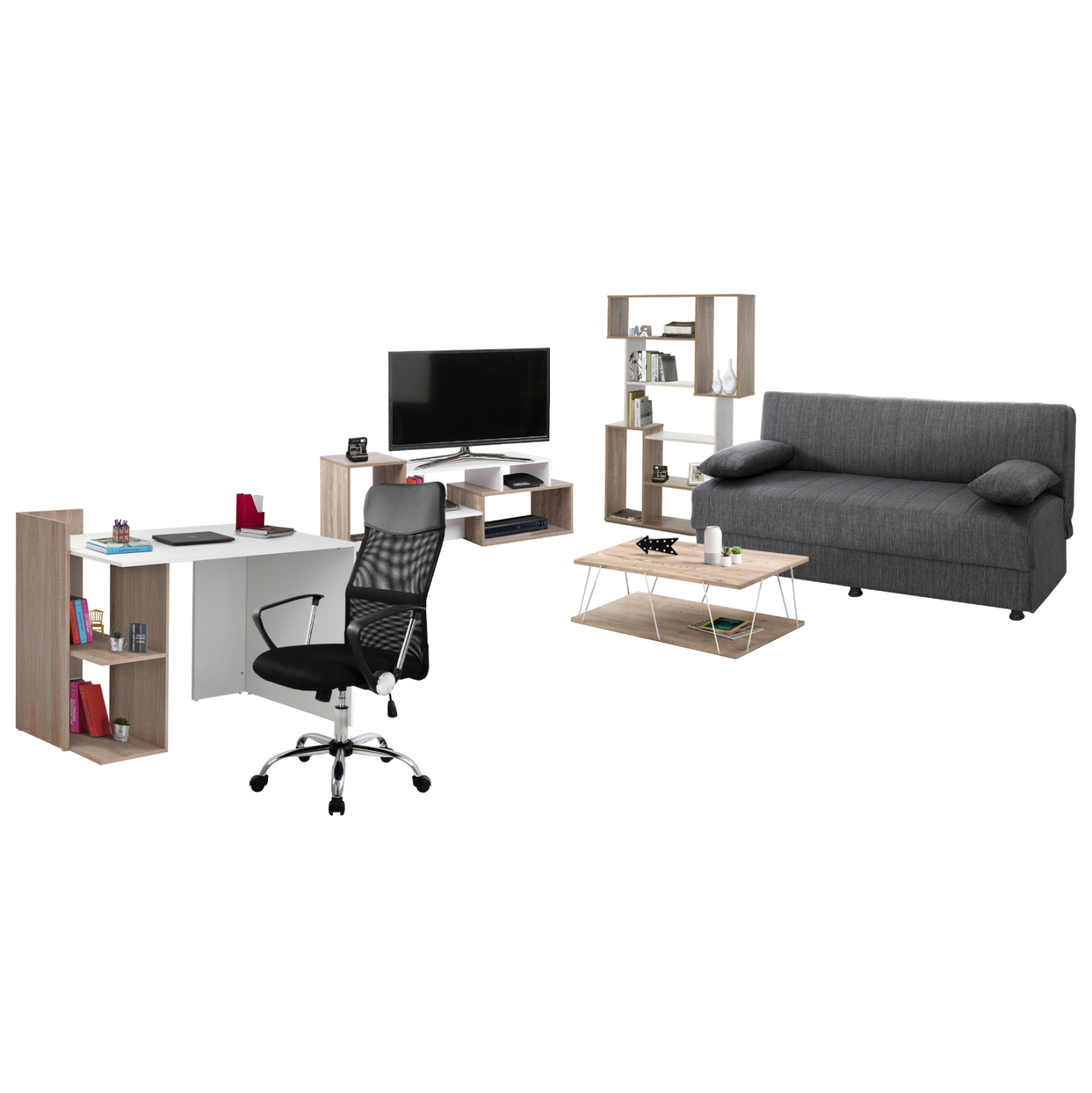 Αυτό το σετ περιλαμβάνει καναπέ, έπιπλο τηλεόρασης, βιβλιοθήκη, τραπέζι σαλονιού, γραφείο με βιβλιοθήκη, καρέκλα γραφείου!