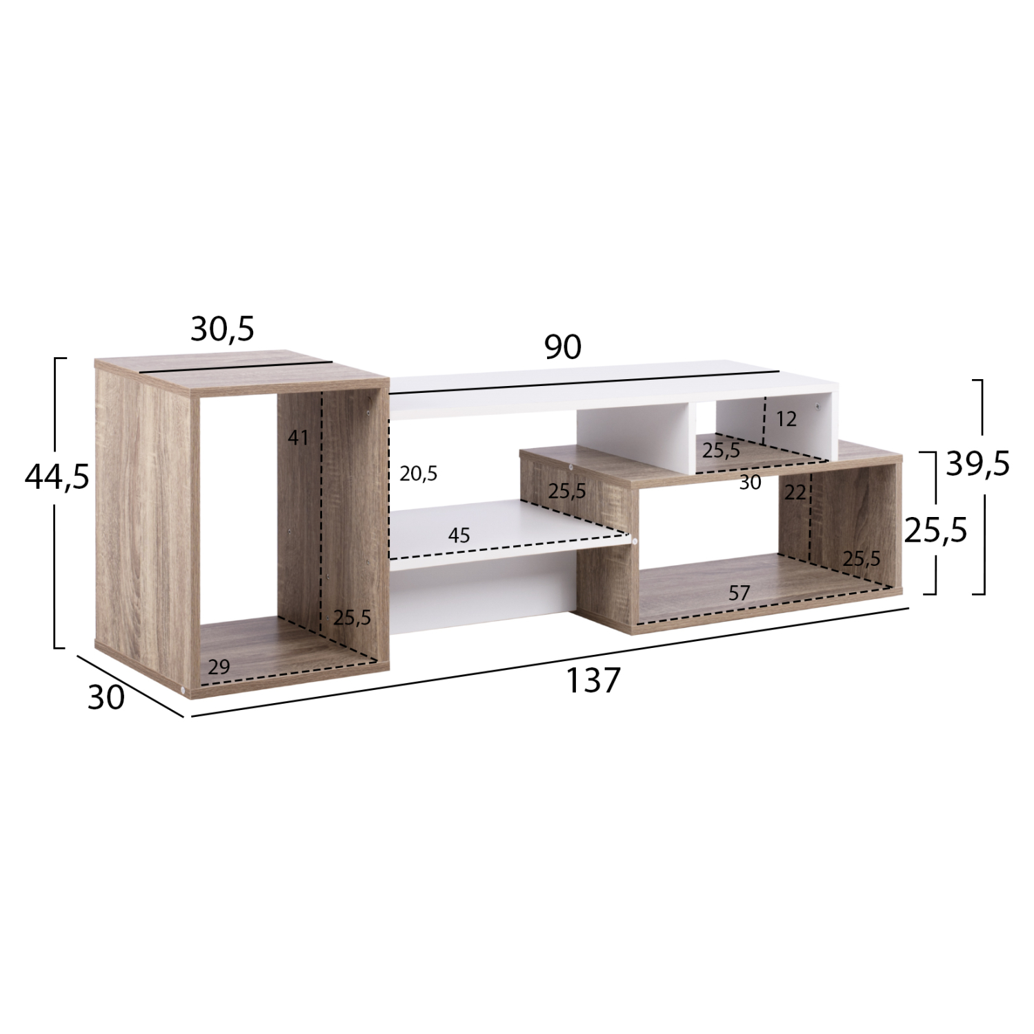 Ασύμμετρο έπιπλο τηλεόρασης σε απόχρωση Sonoma με λευκό. Υλικό: Μελαμίνη. Διαστάσεις: 137,5x30x25,5-39,5-44,5 εκ.