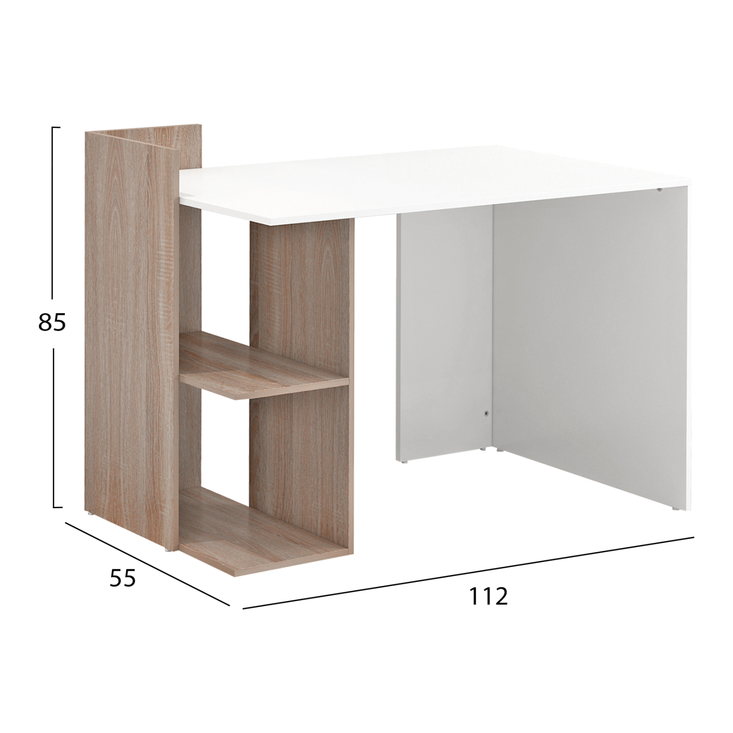 Γραφείο με βιβλιοθήκη με δύο ραφάκια σε σύνθεση, σε απόχρωση Sonoma-λευκό, από μελαμίνη, ξεχωριστό design. Διαστάσεις: 112x55x85Υ εκ