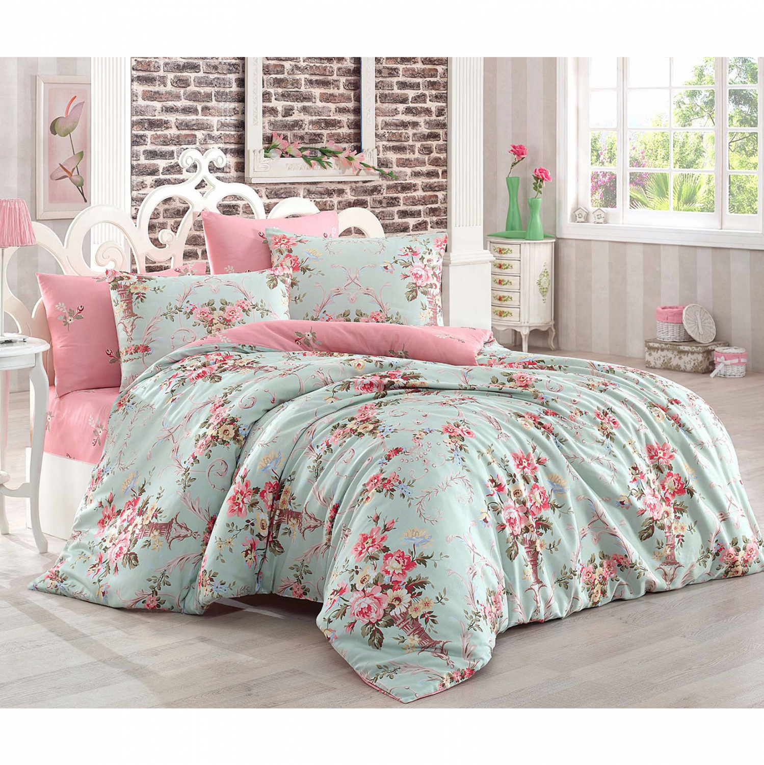 Πρόκειται για ένα σετ άριστης ποιότητας, κατασκευασμένο από 65% βαμβάκι και 35% πολυεστέρα, 120 κλωστών, σε ροζ και γαλάζια – τιρκουάζ απόχρωση με floral pattern.