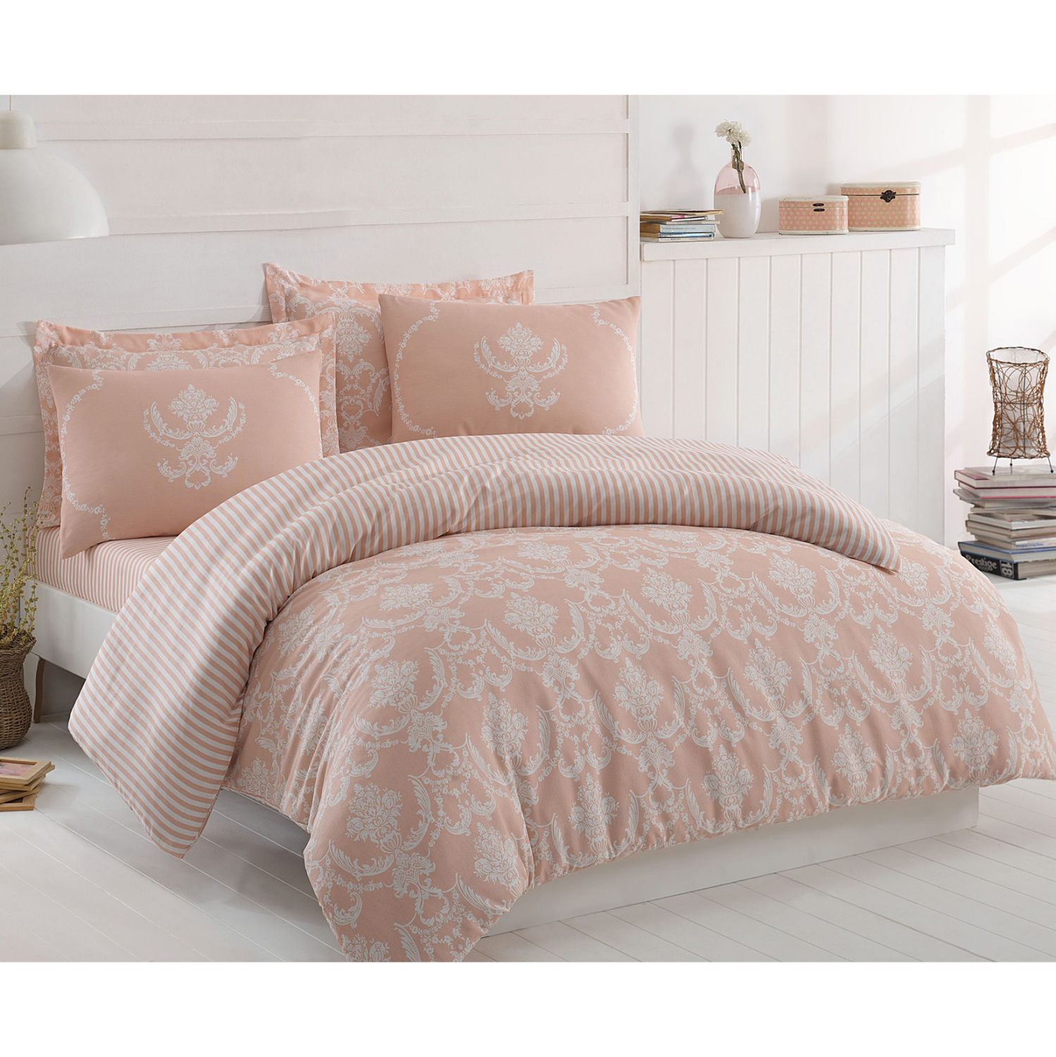 Πρόκειται για ένα σετ άριστης ποιότητας, κατασκευασμένο από 65% βαμβάκι και 35% πολυεστέρα, 120 κλωστών, σε σομόν και λευκή απόχρωση με floral και ριγέ pattern.