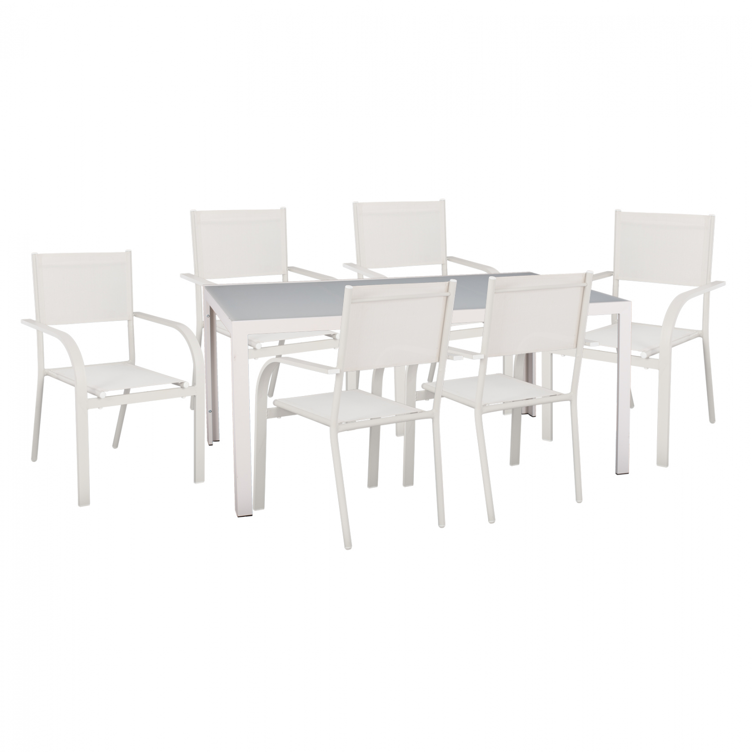 Ένα τραπέζι τραπεζαρίας εξωτερικού χώρου σε λευκή του πάγου απόχρωση με γυαλί στην επιφάνειά του.