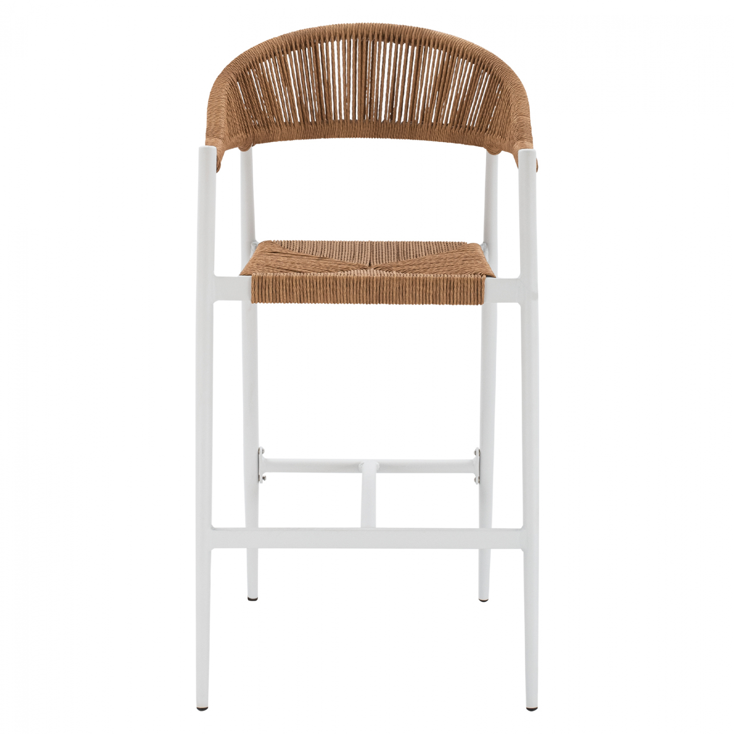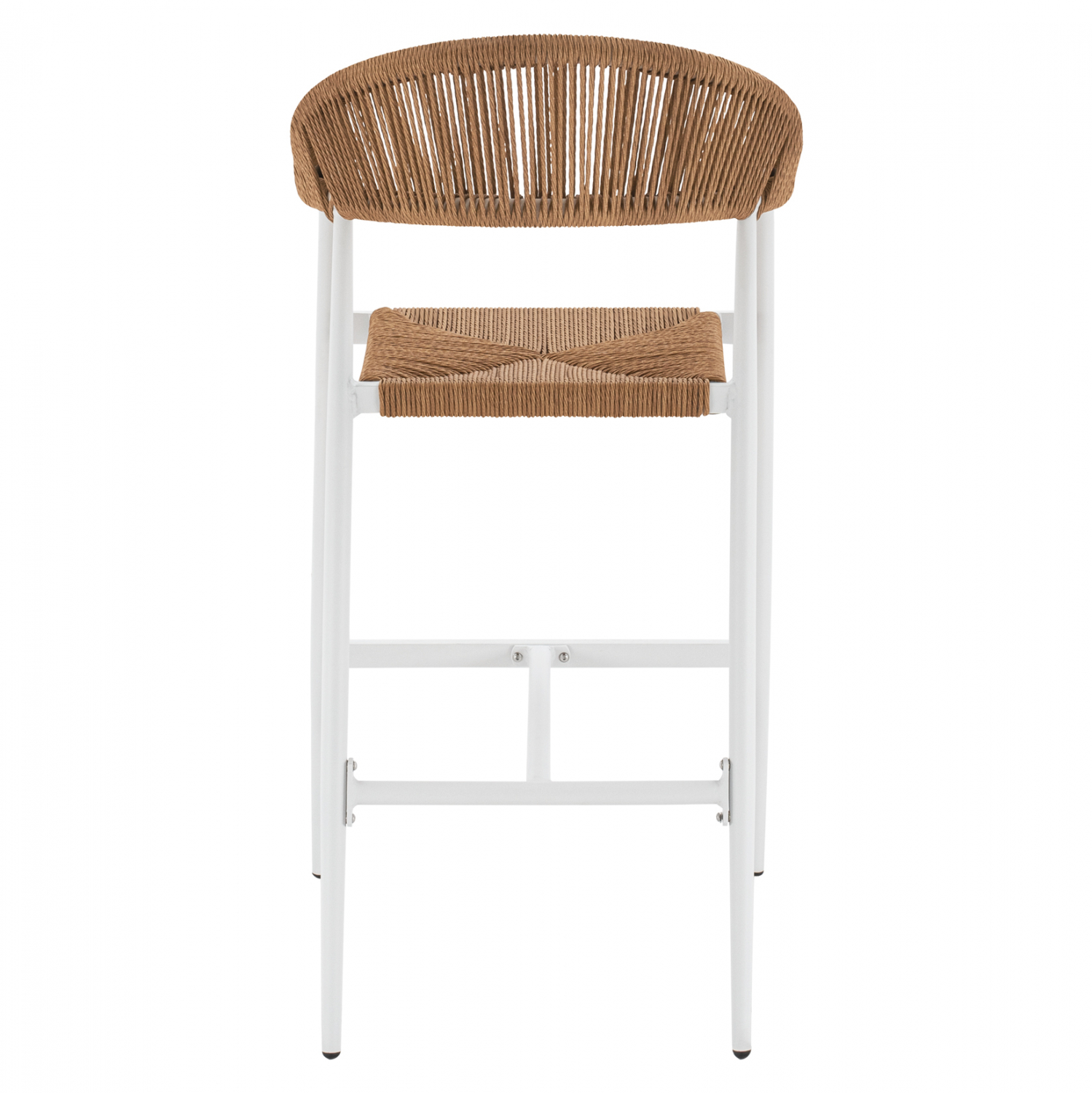Μοντέρνο σκαμπό bar, κατασκευασμένo από σκελετό αλουμινίου σε λευκή απόχρωση, επενδυμένο με πλεκτό ενισχυμένο pe σχοινί στο κάθισμα και στην πλάτη σε μπεζ απόχρωση.